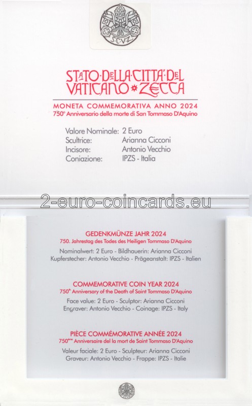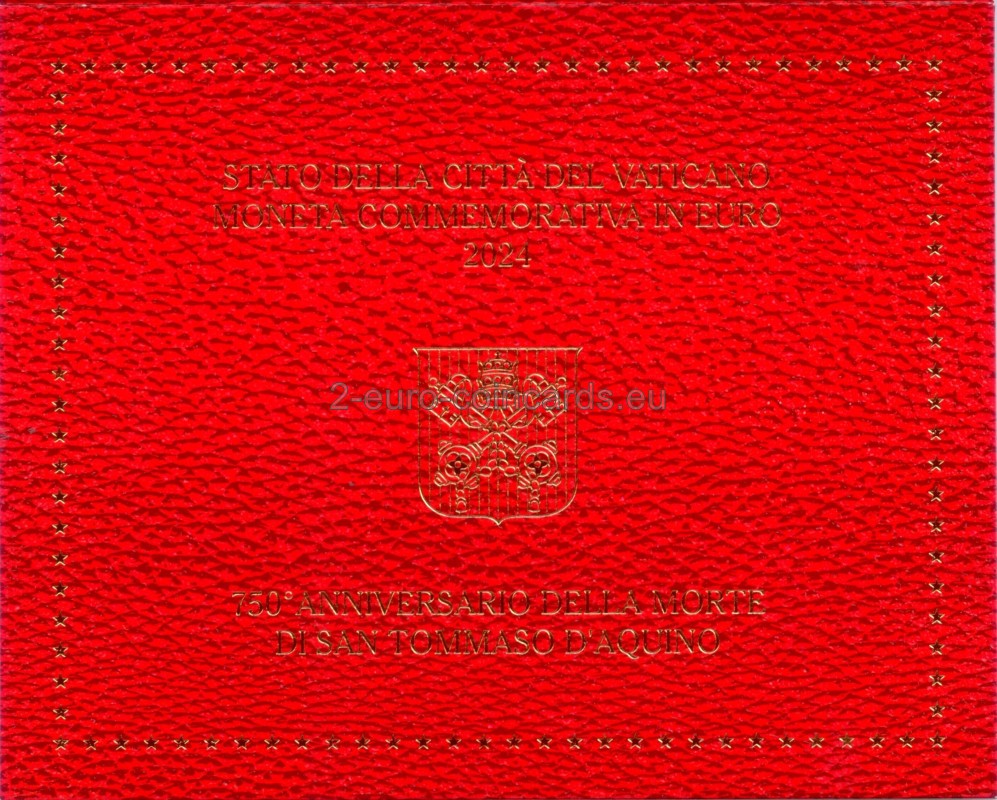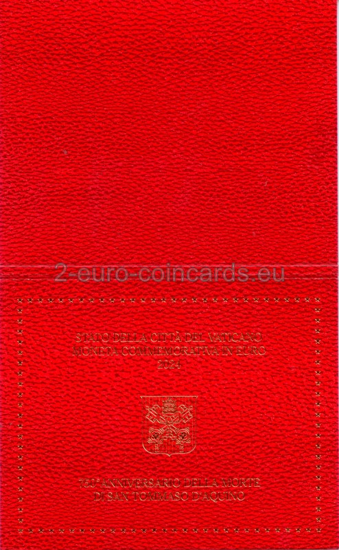 Na minci je v popredí svätý Tomáš Akvinský v habite dominikánskeho rádu, ku ktorému patril. V ľavej ruke drží zväzok svojho najvýznamnejšieho diela Summa Theologica a v druhej ruke drží pierko. Plásť má na hrudi zopnutý 8-cípou hviezdou, jedným zo symbolov dominikánskeho rádu. Spomedzi rôznych titulov, ktoré dostal, je najznámejší titul "anjelský lekár", ktorý oslavuje jeho výnimočnú čistotu duše a tela. V pozadí na ľavej strane je ľalia, symbol čistoty, a Kostol svätého Tomáša v Roccasecce, prvá sakrálna stavba na svete postavená na počesť svätého Tomáša Akvinského, ktorého 18. júla 1323 pápež Ján XXII. vyhlásil za svätého. Pozdĺž horného okraja disku je vyrytý názov vydávajúceho štátu „CITTA' DEL VATICANO“. Naľavo od hlavného obrázku je rok narodenia filozofa „1274“, napravo je rok vydania mince „2024“ a pod ním je značka mincovne „R“. Nápis v spodnej časti v dvoch riadkoch: „DOCTOR ANGELICUS THOMAS AQUINAS“ („ANJELSKÝ DOKTOR THOMAS AQUINAS“, latinsky). Nechýbajú ani iniciály autorky návrhu Arianny Ciccone. „A.CICCONI“ a rytca „AV.INC“.