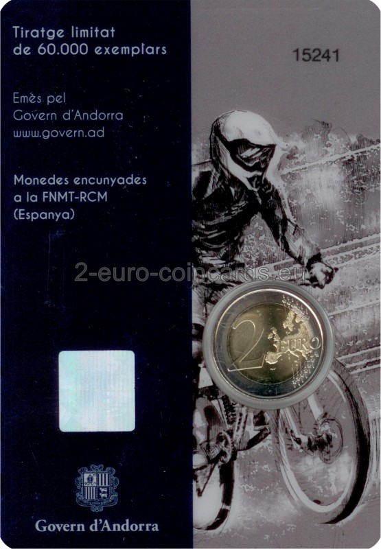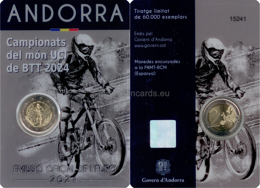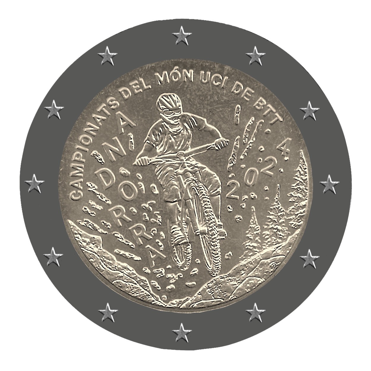 Na zadnej strane mince je vyobrazený cyklista jazdiaci v horskom teréne, čo znázorňuje výnimočný charakter tohto športu, spolu s nápisom „CAMPIONATS DEL MÓN UCI DE BTT“ (Majstrovstvá sveta UCI v horskej cyklistike v roku 2024). Nápisy vydávajúcej krajiny „ANDORRA“ a roku vydania „2024“ sú zobrazené vedľa jazdca z oboch strán, ako keby boli ďalšou súčasťou tohto športu.