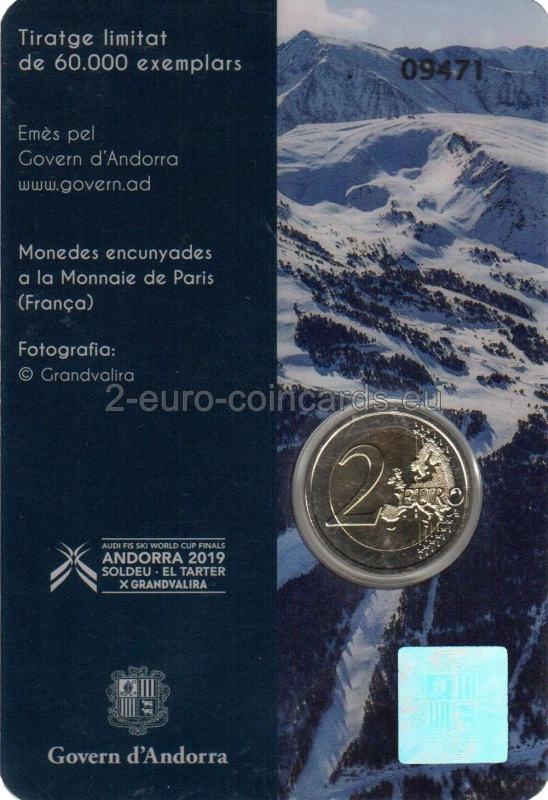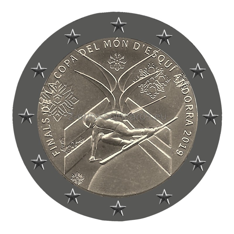 Na vzore mince je v popredí znázornený lyžiar, ako sa spúšťa dolu svahom. Štyri krivky v pozadí, prevzaté z oficiálneho loga týchto finálových pretekov Svetového pohára v alpskom lyžovaní, predstavujú svahy, na ktorých sa súťaží. Vzor dopĺňajú snehové vločky a nápis FINALS DE LA COPA DEL MÓN D’ESQUÍ ANDORRA 2019 (Finále Svetového pohára v alpskom lyžovaní, Andorra 2019).