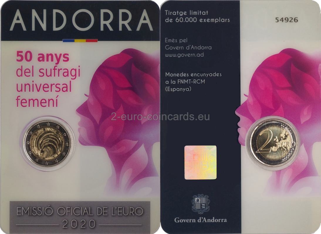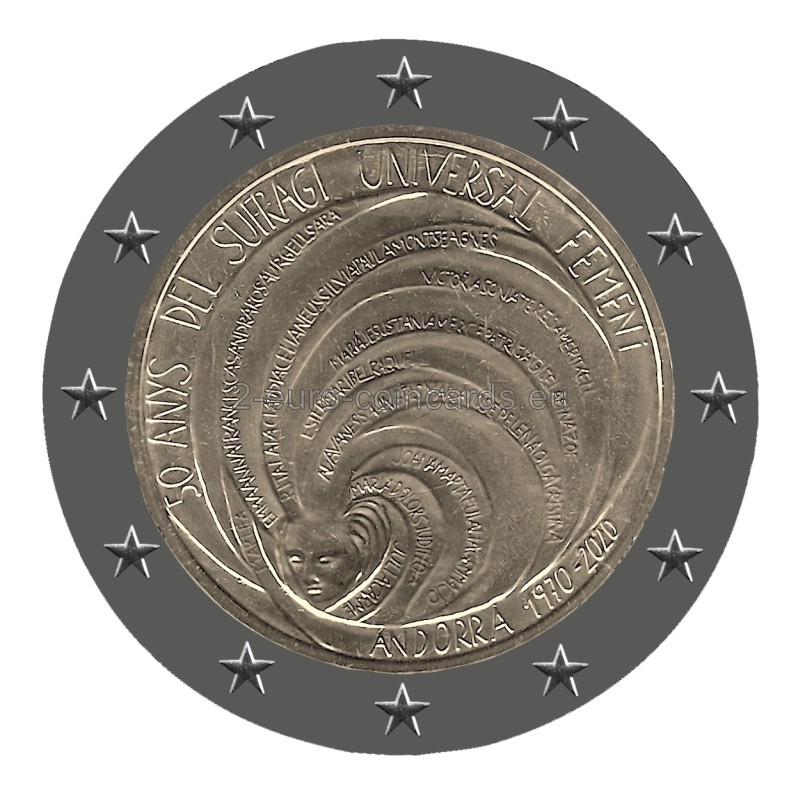 Na minci je vyobrazená ženská tvár, okolo ktorej sa točí spleť čiar. Tieto čiary sú tvorené ženskými menami v katalánčine, ktoré sú umiestnené tesne jedno vedľa druhého, a dajú sa preto len ťažko rozoznať, čo znázorňuje poctu solidarite žien v boji za ich práva. Opakuje sa len jedno meno, „VICTORIA“, ktoré symbolizuje víťazstvo v boji za získanie volebného práva. Vzor dopĺňa nápis „50 ANYS DEL SUFRAGI UNIVERSAL FEMENÍ“ (50 rokov všeobecného volebného práva pre ženy) a „ANDORRA 1970 – 2020“. Tieto nápisy sú takisto súčasťou spleti točiacich sa čiar, čím sa zdôrazňuje význam pripomínaného výročia.