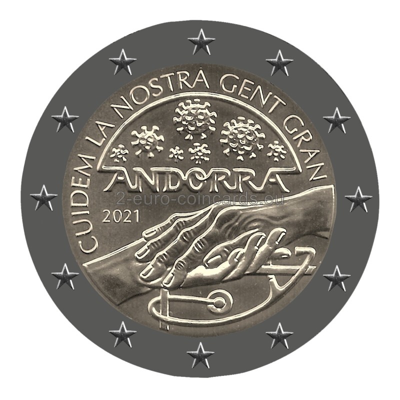 Motív mince „CUIDEM LA NOSTRA GENT GRAN“ (staráme sa o našich seniorov) symbolizuje vyobrazenie ruky mladého človeka, ktorý drží inú ruku vykazujúcu všetky známky starnutia, a pod nimi sa nachádza stetoskop. Názov vydávajúcej krajiny „ANDORRA“ obklopený niekoľkými vyobrazeniami vírusu SARS-CoV-2 predstavuje záväzok štátu zabrániť jeho šíreniu a starať sa o svojich obyvateľov. Na minci je uvedený aj dátum vydania „2021“.