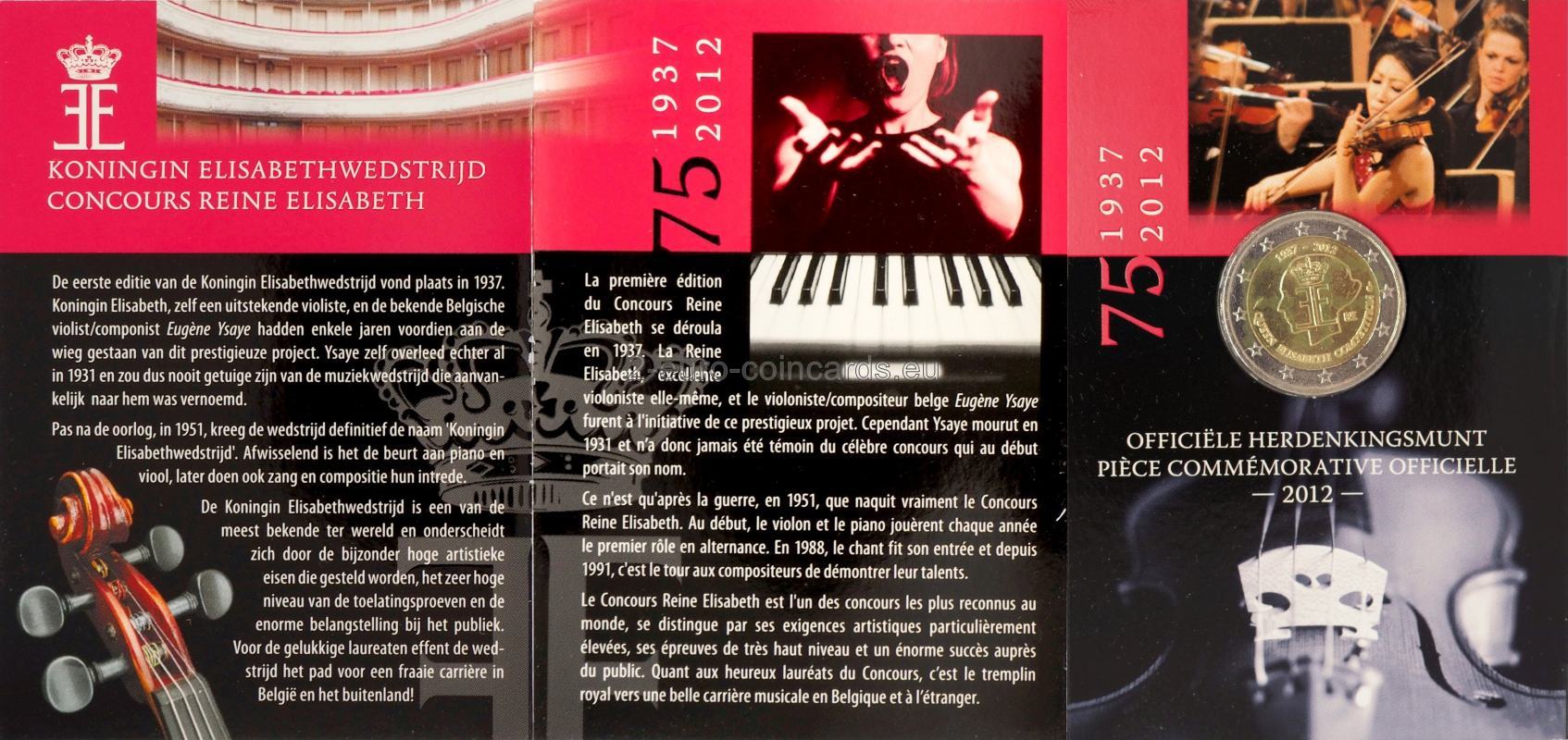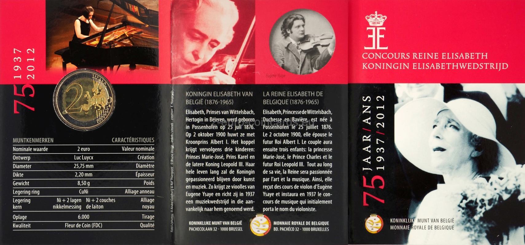 Na vnútornej časti mince je vyobrazené logo Súťaže kráľovnej Alžbety na podobizni tváre kráľovnej Alžbety z ľavej strany. Vľavo od loga je vyrazená značka generálneho riaditeľa mincovne Serge Lesensa (husie brko) a vpravo značka belgickej mincovne (hlava archanjela Michaela s prilbicou). Nad podobizňou sú vyznačené letopočty 1937 – 2012 označujúce 75. výročie súťaže. Pod podobizňou je nápis „QUEEN ELISABETH COMPETITION“. Označenie vydávajúceho štátu „BE“ sa nachádza napravo od podobizne.