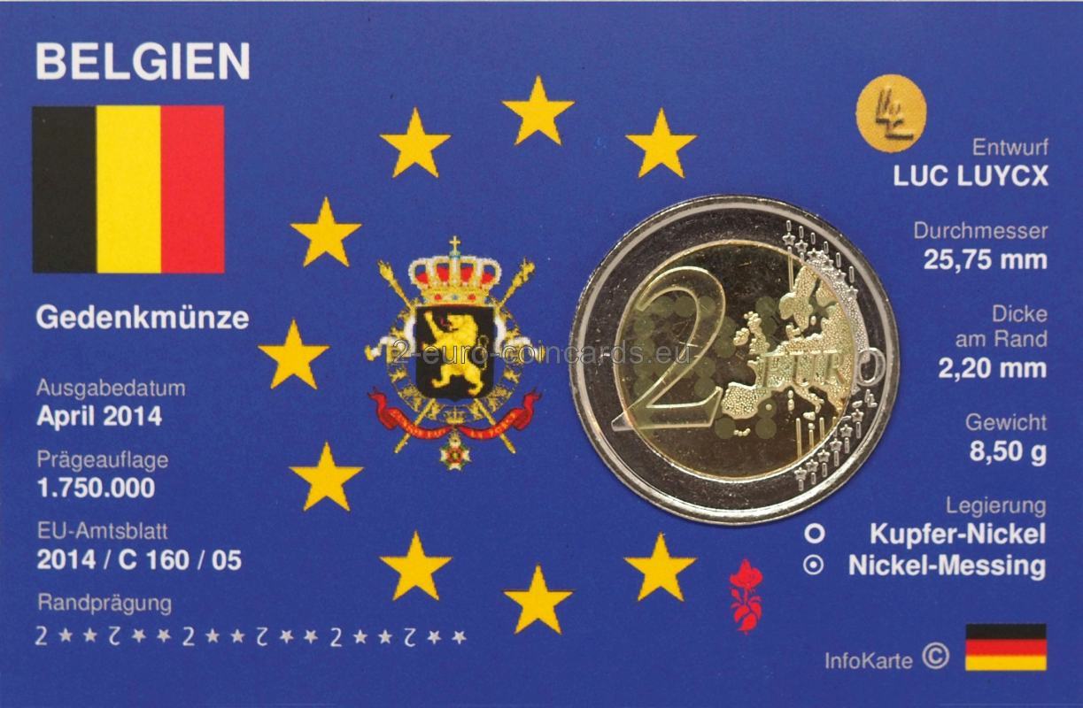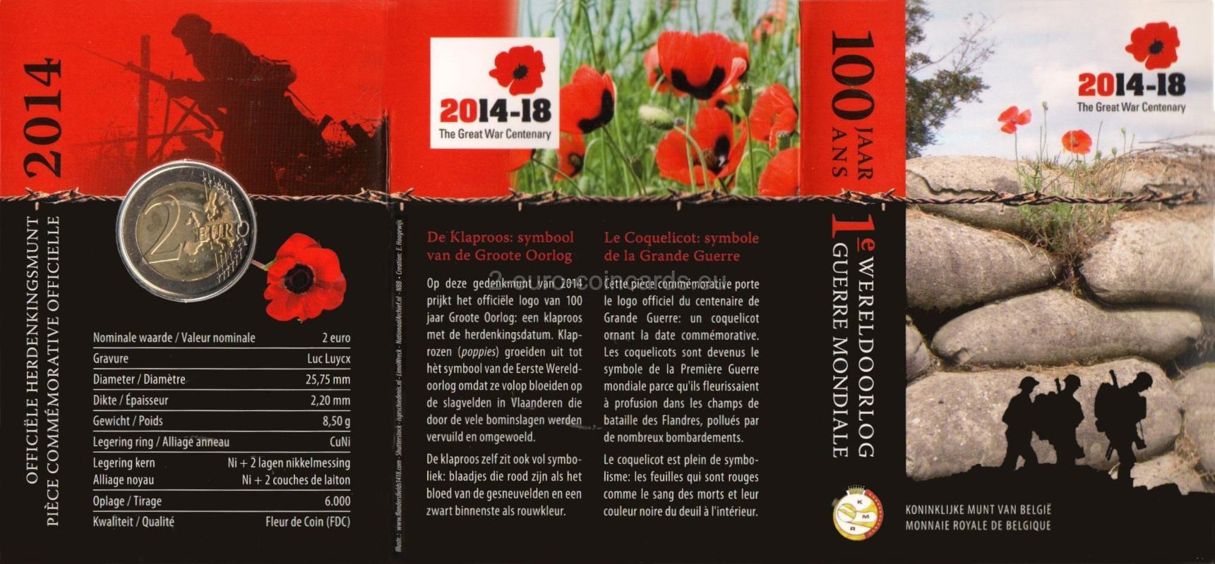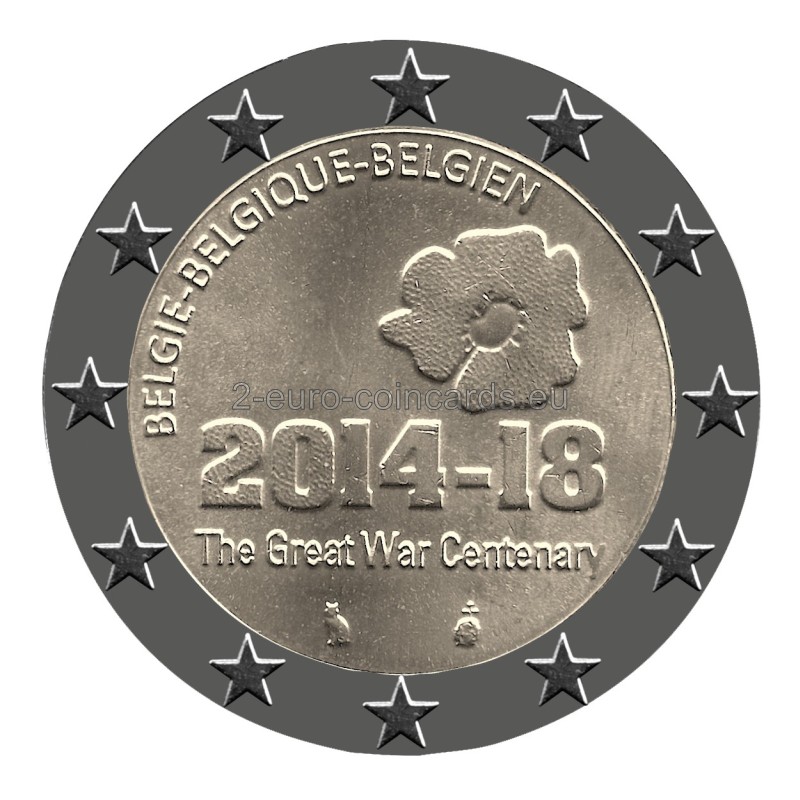 Na tejto pamätnej minci je oficiálne logo stého výročia Veľkej vojny: mak s pamätným dátumom. Maky sa stali symbolom prvej svetovej vojny, pretože hojne kvitli na bojiskách vo Flámsku, ktoré bolo zničené početným bombardovaním. Samotný mak je tiež plný symboliky: okvetné lístky sú červené ako krv padlých, a čierny vnútrajšok je ako farba smútku.