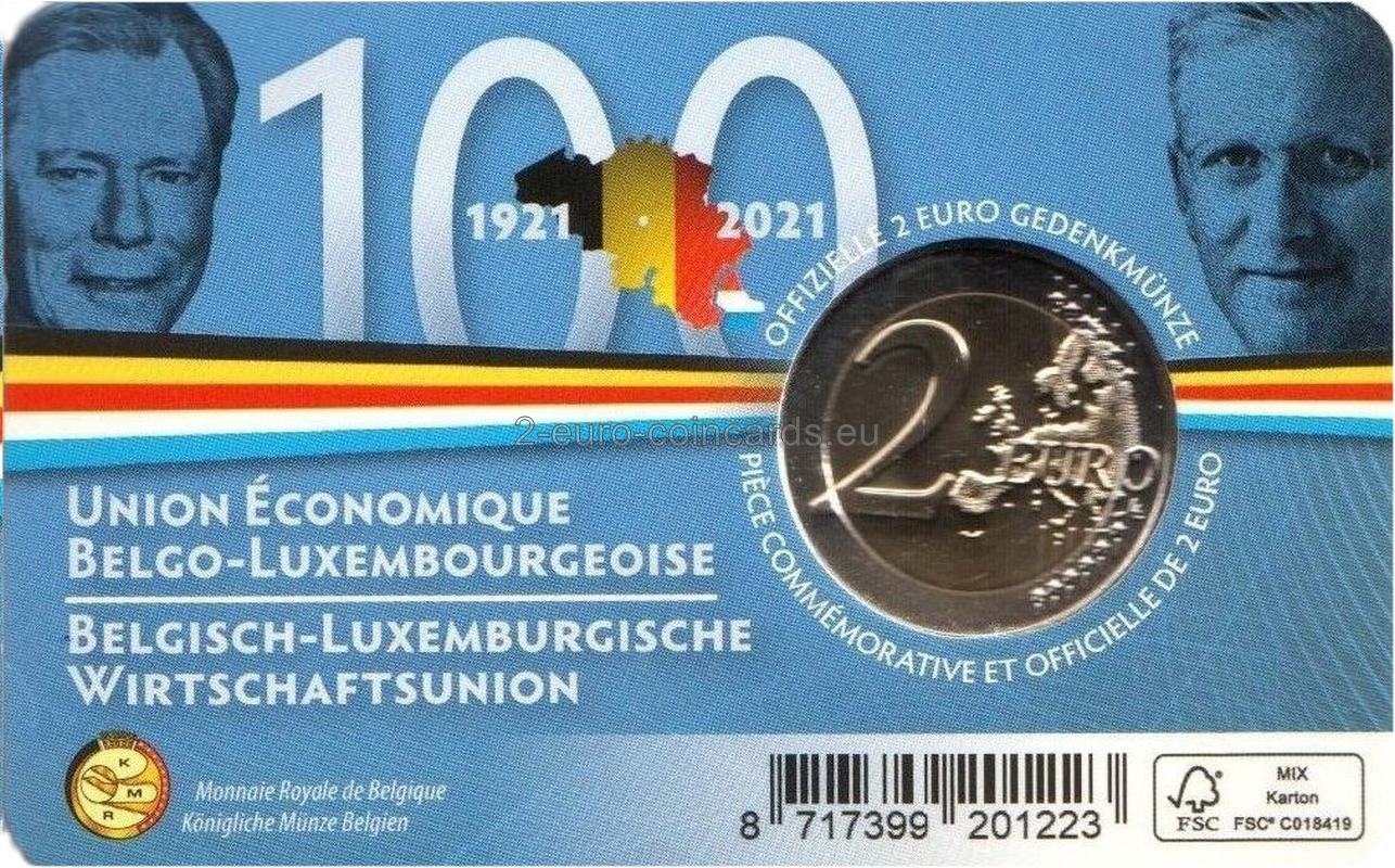 Na národnej strane mince sa nachádza podobizeň belgického kráľa Filipa I. a luxemburského veľkovojvodu Henriho. Okrem toho sú na minci vyobrazené obe krajiny a uvádza sa na nej názov „ECONOMIC UNION“ (hospodárska únia) a roky 1921 a 2021. V dolnej časti mince sa nachádza značka Kráľovskej holandskej mincovne v Utrechte (Merkúrova palica), ako aj značka riaditeľky belgickej mincovne Ingrid van Herzele (erb mesta Herzele). Na minci sa nachádzajú aj iniciály autora mince Luca Luycxa (LL).