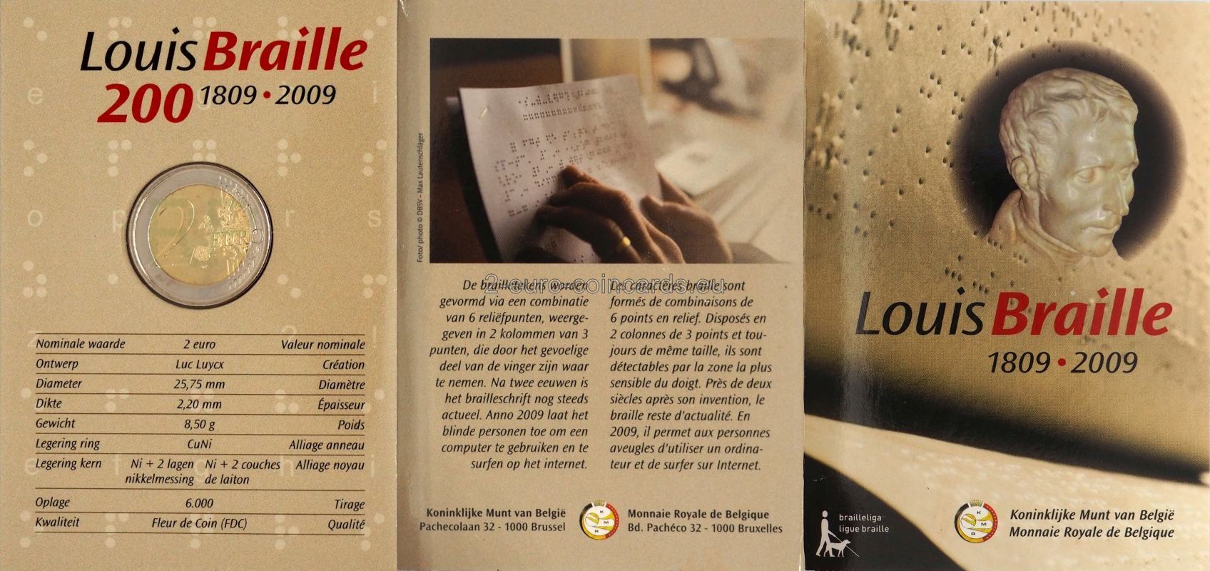 Na vnútornej časti mince je vyobrazená podobizeň Louisa Braillea, vynálezcu slepeckého písma, umiestnená medzi jeho iniciály L a B napísané písmom, ktoré vytvoril. Nad podobizňou je nápis „LOUIS BRAILLE“ a pod ňou je medzi rokmi 1809 a 2009 uvedená skratka vydávajúcej krajiny „BE“. Naľavo sa nachádza značka belgickej mincovne (hlava archanjela Michaela) a napravo značka riaditeľa mincovne Serge Lesensa (husie brko).