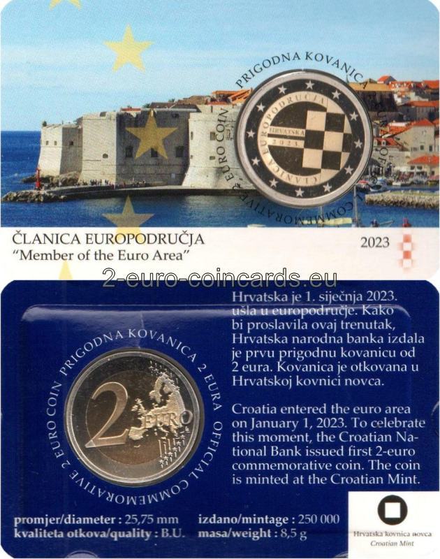 Chorvátsko vstúpilo do eurozóny 1. januára 2023. Na oslavu tohto okamihu vydala Chorvátska národná banka prvú pamätnú mincu v hodnote 2 eurá. Mincu razila chorvátska mincovňa.