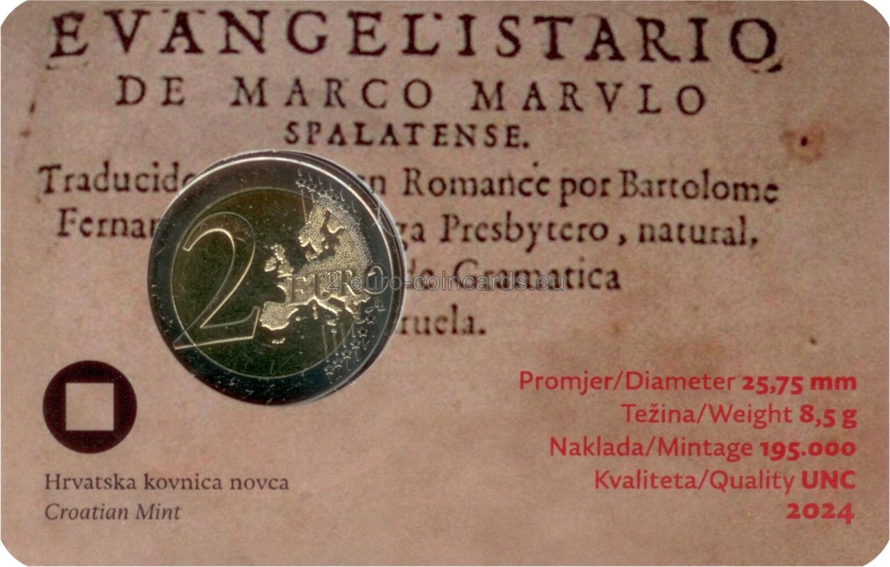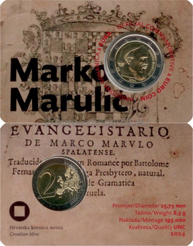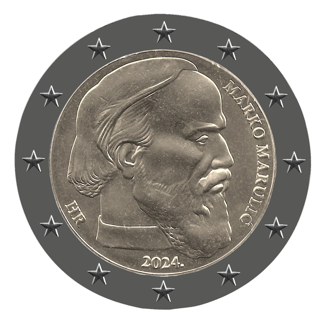 Zadná strana mince v strede zobrazuje portrét spisovateľa, v spodnej časti je letopočet vydania "2024", vľavo skratka vydávajúcej krajiny "HR" a vpravo meno spisovateľa "MARKO MARULIĆ". Autorom návrhu národnej strany je akademický sochár Stjepan Divković.