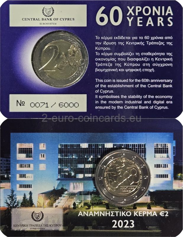 Na minci je vyobrazené náradie na mikročipe symbolizujúce stabilitu hospodárstva v modernej priemyselnej a digitálnej ére zabezpečenú Centrálnou bankou Cypru, V dolnej časti sa nachádza názov vydávajúcej krajiny „ΚYΠΡΟΣ KIBRIS“ a roky „1963 – 2023“. Vo vnútornej časti národnej strany mince je tiež uvedená veta „60 ΧΡOΝΙΑ ΑΠO ΤΗΝ IΔΡΥΣΗ ΤΗΣ ΚΕΝΤΡΙKHΣ ΤΡAΠΕΖΑΣ ΤΗΣ ΚYΠΡΟΥ“ (t. j. 60 rokov od založenia Centrálnej banky Cypru).