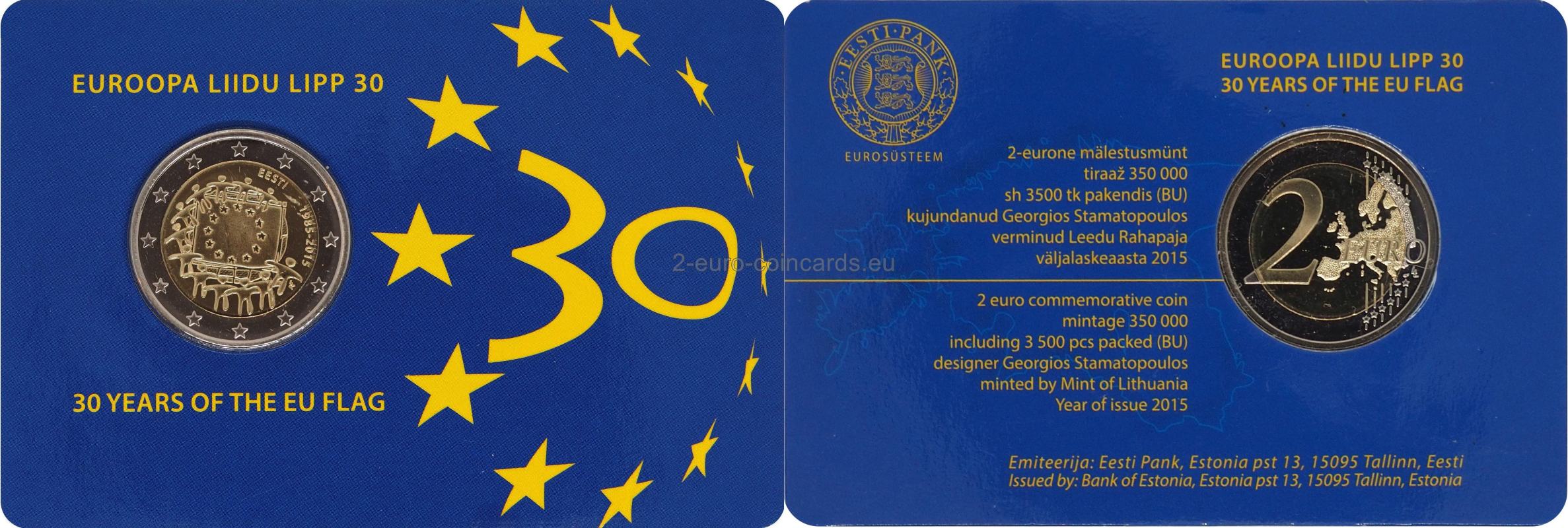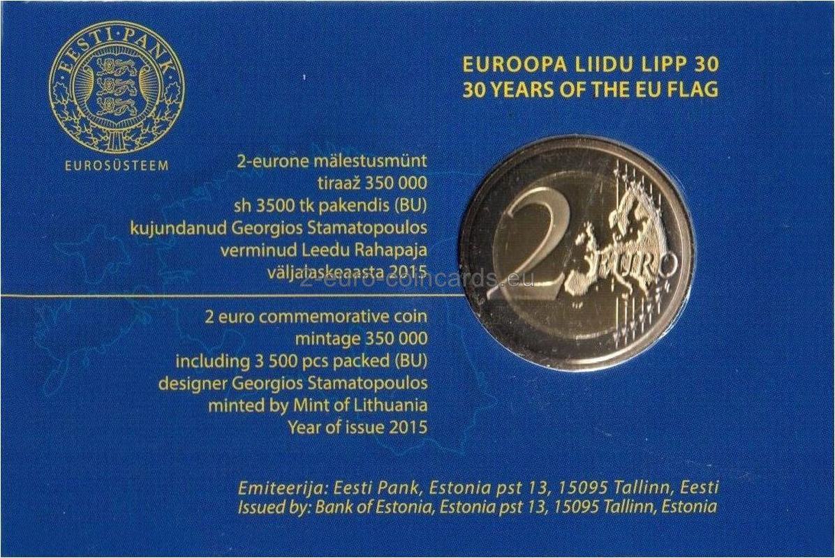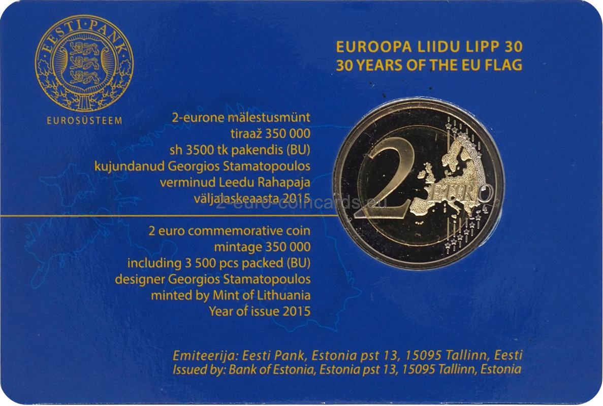 Vzor zobrazuje vlajku EÚ ako symbol, ktorý spája ľudí a kultúry s rovnakými víziami a ideálmi lepšej spoločnej budúcnosti. Dvanásť hviezd, ktoré sa menia na ľudské postavy, predstavuje zrodenie novej Európy. Vpravo hore je v polkruhu uvedený názov vydávajúcej krajiny „EESTI“ a roky „1985 – 2015“. Vpravo dolu sa nachádzajú iniciály umelca Georgiosa Stamatopoulosa „ΓΣ“.