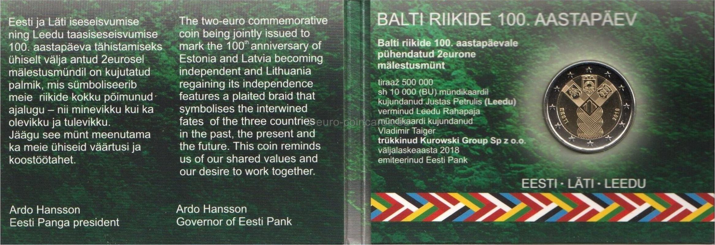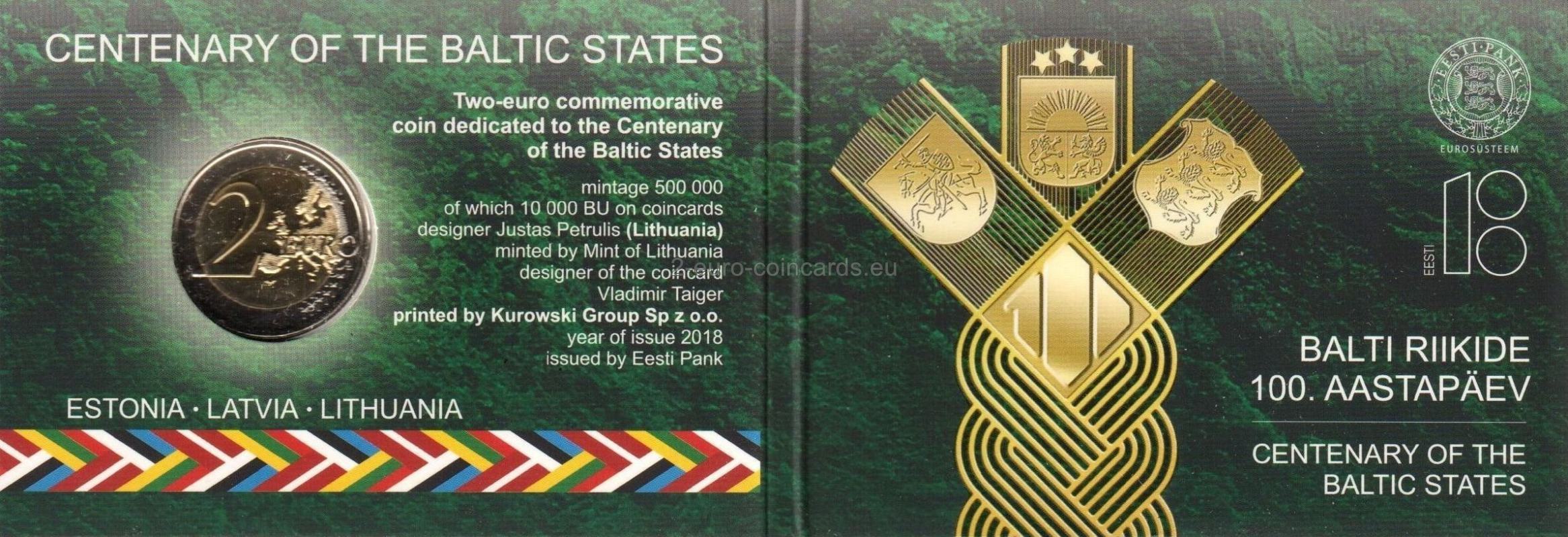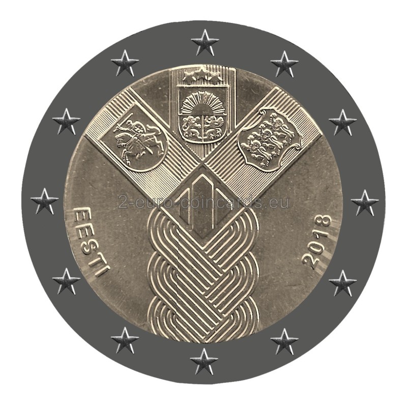 Pri príležitosti 100. výročia nezávislosti pobaltských štátov sa centrálne banky týchto krajín dohodli na vydaní spoločnej pamätnej mince v hodnote 2 EUR s jednotným dizajnom. Jediným rozdielom je názov vydávajúcej krajiny. Tri pobaltské štáty sú symbolicky znázornené vo forme vrkoča. Spája ich história: spoločná minulosť, súčasnosť a budúcnosť. Súčasťou motívu je aj štylizovaná číslica predstavujúca 100. výročie a heraldické symboly všetkých troch štátov. Na ľavej strane sa nachádza názov vydávajúcej krajiny „EESTI“ a na pravej strane rok vydania „2018“. Tento návrh bol vybraný na základe verejného hlasovania vo všetkých troch pobaltských krajinách.