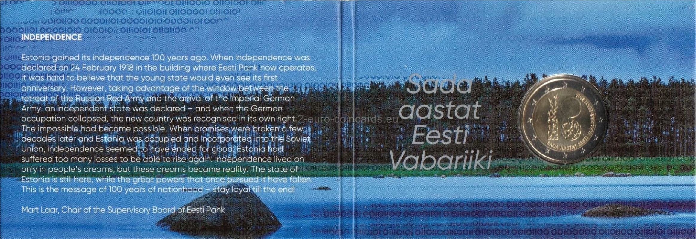 Estónsko získalo nezávislosť pred 100 rokmi. Keď bola 24. februára 1918 vyhlásená nezávislosť v budove, v ktorej dnes pôsobí Eesti Pank, bolo ťažké uveriť, že sa mladý štát dožije aj svojho prvého výročia! Využitím obdobia medzi ústupom ruskej Červenej armády a príchodom cisárskej nemeckej armády však bol vyhlásený nezávislý štát - a keď sa nemecká okupácia zrútila, nový štát bol uznaný ako samostatný. Nemožné sa stalo možným. Keď sa o niekoľko desaťročí neskôr sľuby porušili a Estónsko bolo okupované a začlenené do Sovietskeho zväzu, zdalo sa, že nezávislosť sa nadobro skončila: Estónsko utrpelo príliš veľa strát na to, aby mohlo znovu povstať. Nezávislosť žila ďalej len v ľudských snoch, ale tieto sny sa stali skutočnosťou. Estónsky štát je stále tu, zatiaľ čo veľmoci, ktoré ho kedysi prenasledovali, padli. To je posolstvo 100 rokov štátnosti - zostaňte verní až do konca!