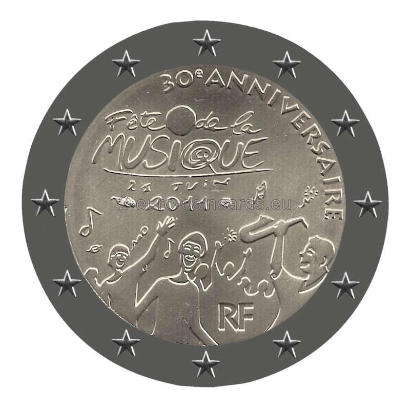 Na vnútornej strane mince sú zobrazené zástupy veselých ľudí so štylizovaným znázornením hudobného nástroja a notami poletujúcimi vo vzduchu na vyjadrenie slávnostnej atmosféry sviatku hudby. V strede obrázka je text „Fête de la MUSIQUE“ (Sviatok hudby) a dátum „21 JUIN 2011“ (21. jún 2011). V hornej časti sa smerom doprava nakláňa text „30 e ANNIVERSAIRE“ (30. výročie) a v spodnej časti je označenie krajiny „RF“. Okolo letopočtu 2011 sa nachádzajú značky parížskej mincovne (roh hojnosti), vedúceho rytca Yvesa Sampa (päťuholník).