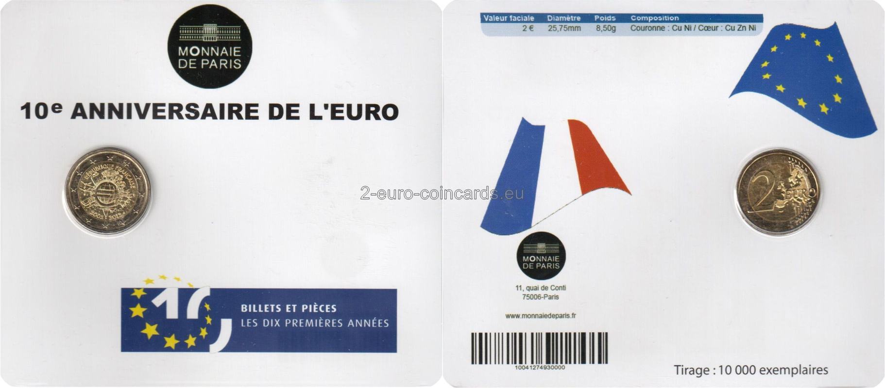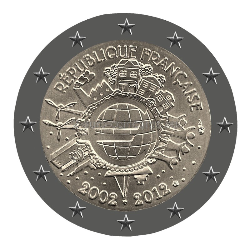 Znak eura v strede mince znamená, že euro sa stalo mimoriadne dôležitou súčasťou Európy, ale aj sveta, pretože sa v priebehu posledných 10 rokov stalo globálnym hráčom v rámci medzinárodného menového systému. Jednotlivé prvky motívu okolo symbolu eura na minci vyjadrujú význam eura pre ľudí, pre finančný svet (veža ECB), pre obchod (lode), priemysel (továrne), pre odvetvie energetiky, výskumu a vývoja (veterné elektrárne). Iniciály autora návrhu „A.H.“ sa dajú objaviť (ak sa pozriete veľmi pozorne) medzi loďou a budovou Eurotower. Pozdĺž horného okraja vnútornej časti mince je uvedená krajina vydania (RÉPUBLIQUE FRANÇAISE), zatiaľ čo označenie 2002 – 2012 je umiestnené v dolnej časti. V pravej časti sa nachádzajú značky parížskej mincovne (roh hojnosti) a vedúceho rytca Yvesa Sampa (päťuholník).