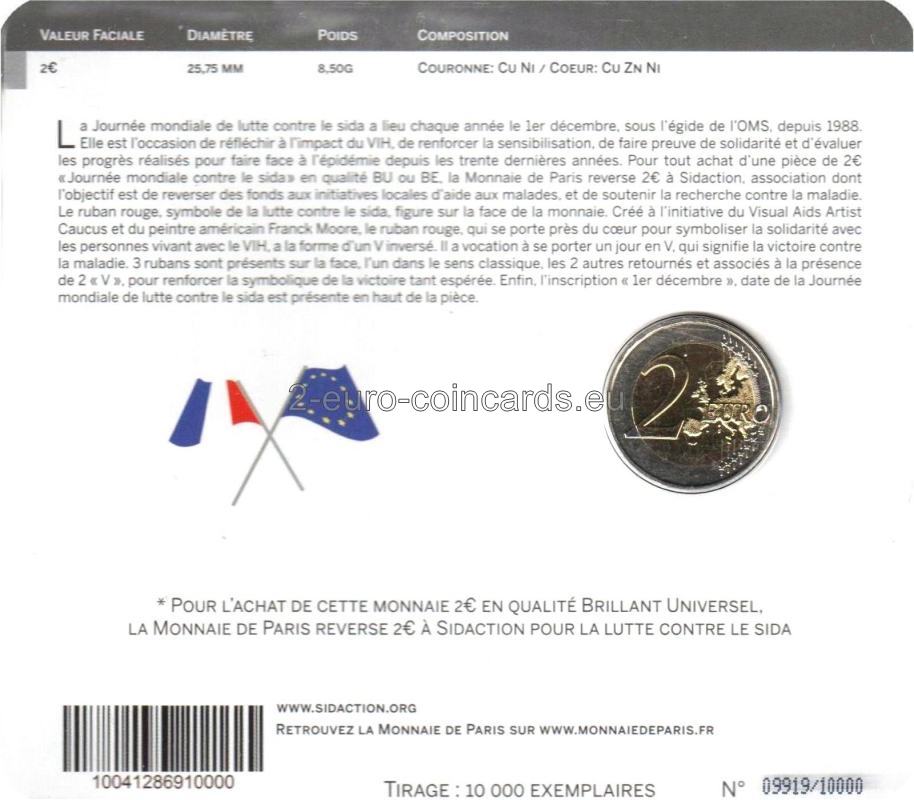 Svetový deň AIDS sa pod záštitou WHO koná každoročne 1. decembra od roku 1988. Je to príležitosť zamyslieť sa nad vplyvom HIV, zvýšiť informovanosť, prejaviť solidaritu a zhodnotiť pokrok, ktorý sa dosiahol v boji proti epidémii za posledných tridsať rokov. Za každý nákup mince "Svetový deň boja proti AIDS" v hodnote 2 € v kvalite BU alebo BE venuje Monnaie de Paris 2 € združeniu Sidaction, ktorého cieľom je venovať finančné prostriedky miestnym iniciatívam na podporu pacientov a na podporu výskumu tejto choroby. Na líci mince sa nachádza červená stužka, symbol boja proti AIDS. Červená stužka, ktorá sa nosí blízko srdca ako symbol solidarity s ľuďmi žijúcimi s HIV, vznikla z iniciatívy Visual Aids Artist Caucus a amerického maliara Francka Moora a má tvar obráteného písmena V. Má sa nosiť jeden deň ako V znamenajúce víťazstvo nad chorobou. Na prednej strane sú 3 stužky. Jedna je v tradičnom smere, ďalšie 2 sú obrátené a spojené s dvomi "V" na posilnenie symboliky dlho očakávaného víťazstva. Nakoniec sa v hornej časti mince nachádza nápis "1. december", dátum Svetového dňa boja proti AIDS.
