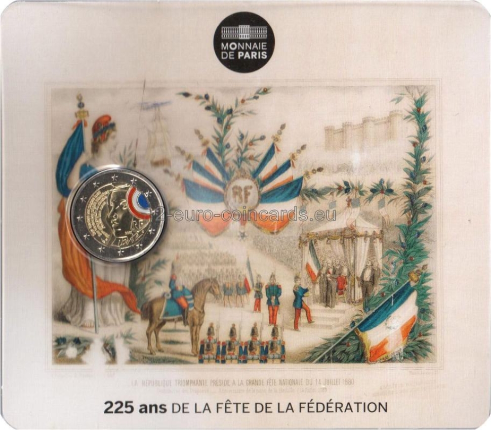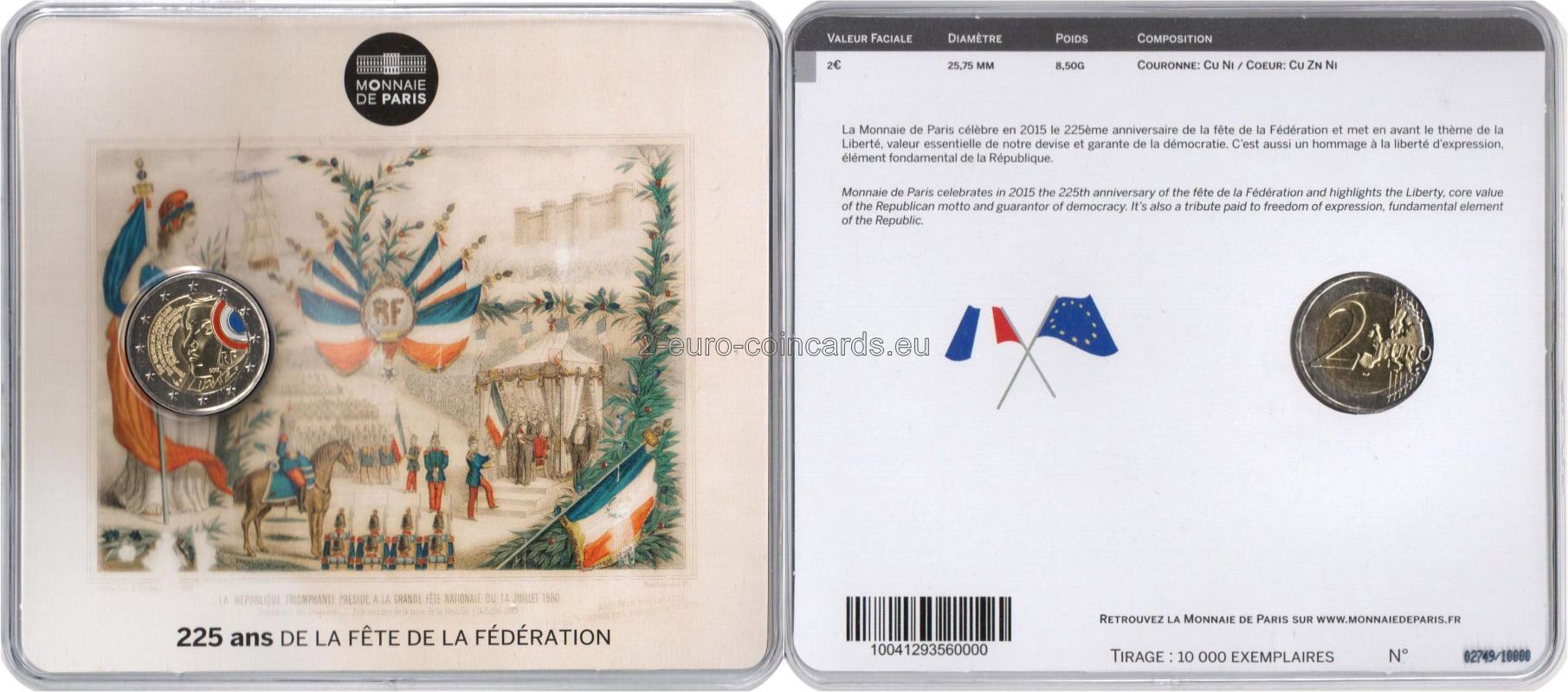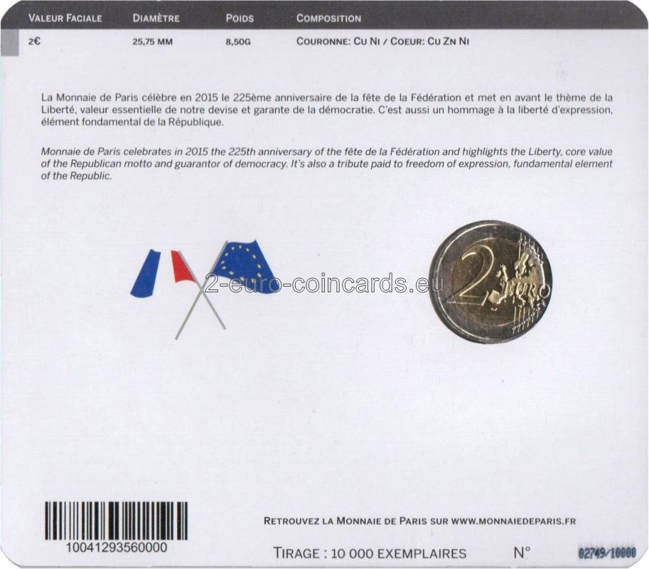 Francúzsky štátny sviatok „Fête de la Fédération“ združuje všetkých Francúzov pri príležitosti osláv republiky. Motívom mince je grafickým, moderným spôsobom zobrazený profil Marianne, symbolu republiky. Marianne má na hlave frýgickú čiapku. Na pravej strane je načrtnutá kokarda a pod ňou sú písmená „RF“. Uprostred mince je uvedený rok „2015“. Na ľavej strane sa nachádza strofa "Sur toutes les pages lues Sur toutes les pages blanches Pierre sang papier ou cendre J’ecris ton nom" (Na všetky stránky, ktoré som čítal Na všetky prázdne listy Ku kameňu krvi, papiera a popola píšem tvoje meno) básne „Sloboda“ francúzskeho básnika Paula Éluarda, ktorá je odkazom na heslo republiky. Vedľa tohto úryvku sú uvedené značky sú značky parížskej mincovne Monnaie de Paris (roh hojnosti) a hlavného rytca Yvesa Sampa (päťuholník). Obrázok blistra vychádza z pohľadnice z konca 19. storočia.