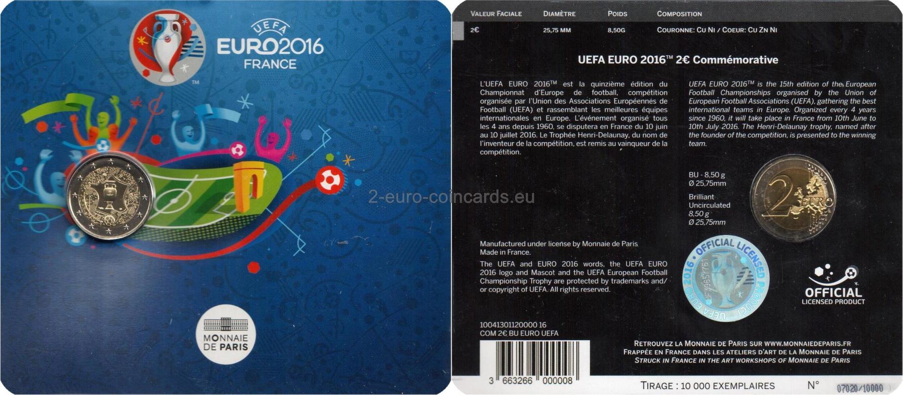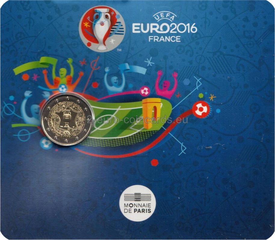 Na minci je vyobrazený pohár Henriho Delaunaya uprostred obrysu mapy Francúzska spolu s značkami parížskej mincovne Monnaie de Paris (roh hojnosti) a hlavného rytca Yvesa Sampa (päťuholník). Napravo od mapy Francúzska sú uvedené iniciálky Francúzskej republiky „RF“. Nad mapou Francúzska vytvára pomyselnú korunu názov súťaže „UEFA EURO 2016 France“. V spodnej časti mince vystupuje do popredia lopta. Toto všetko je umiestnené na pozadí, ktoré tvoria grafické prvky reprezentujúce súťaž.