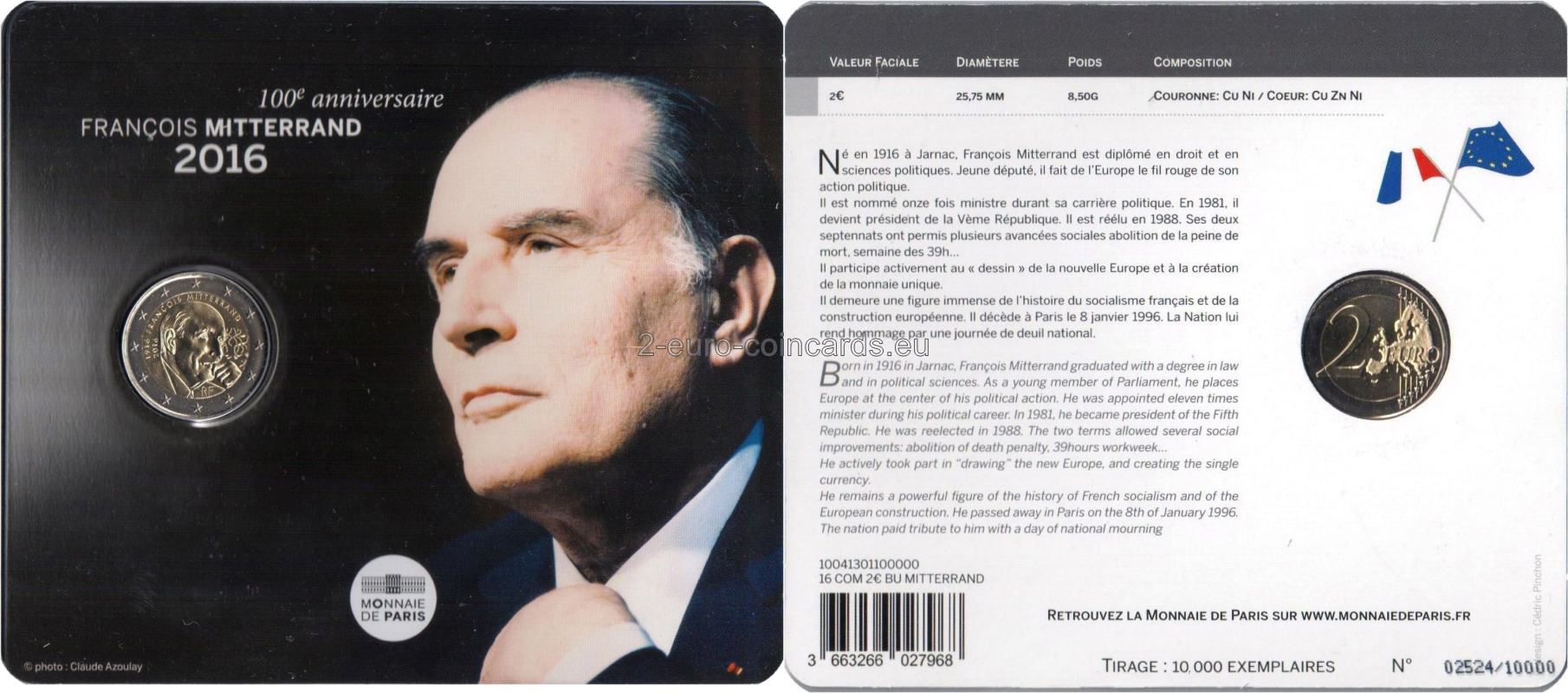 Na minci je načrtnutá tvár zamysleného Françoisa Mitterranda z profilu. Vedľa je zobrazený Mitterandov osobný emblém, prepletené vetvy duba a olivovníka. Nižšie sú značky parížskej mincovne Monnaie de Paris (roh hojnosti) a hlavného rytca Yvesa Sampa (päťuholník). V hornej časti je uvedený jeho dátum narodenia a stého výročia narodenia („1916“ a „2016“), ako aj jeho meno. Dole je uvedené označenie vydávajúcej krajiny „RF“.