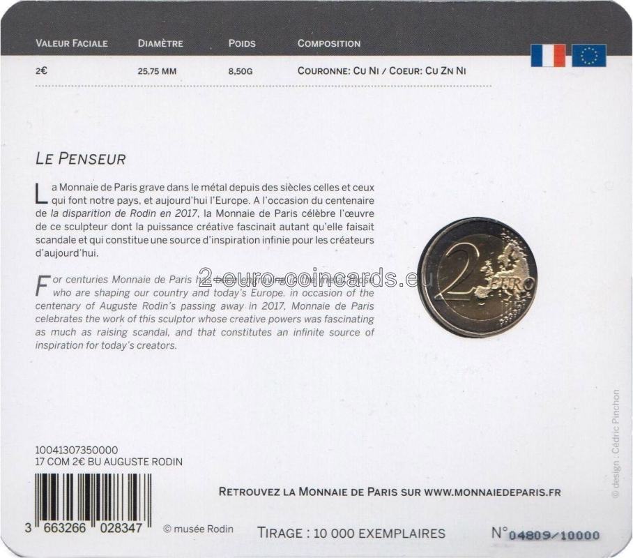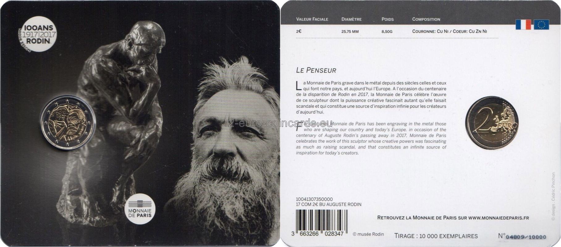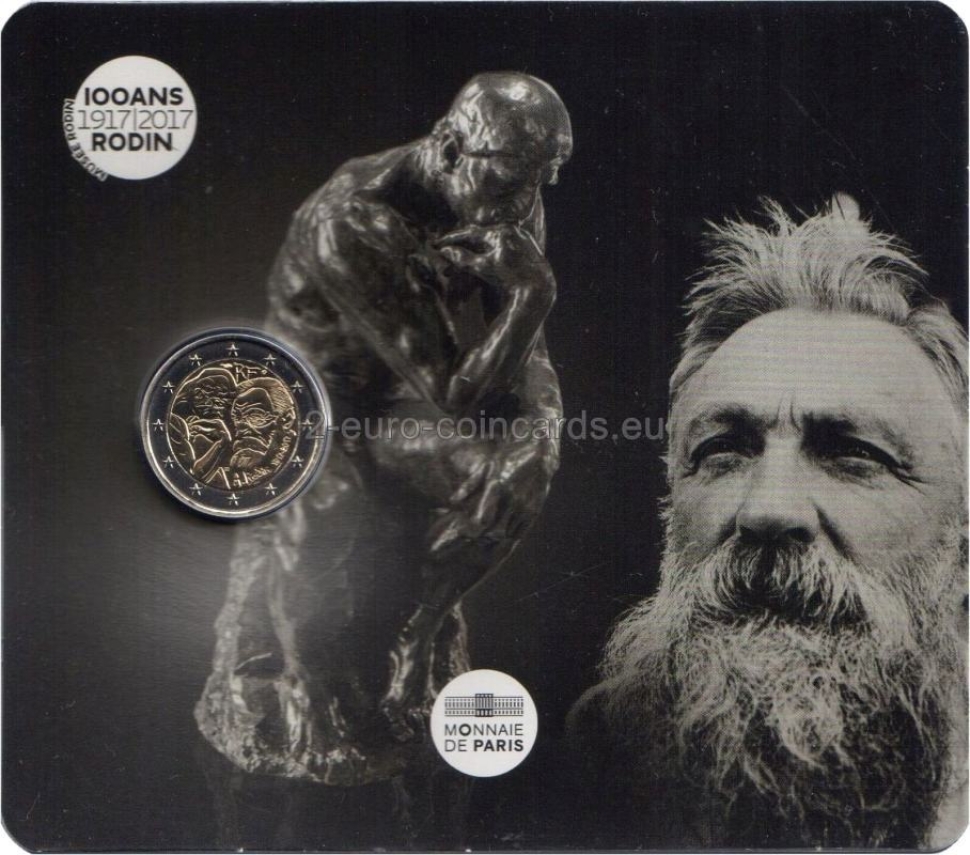 Parížska mincovňa Monnaie de Paris vzdáva hold významnému francúzskemu sochárovi Augustovi Rodinovi pri príležitosti 100. výročia jeho úmrtia. Motív mince zobrazuje naproti sebe Augusta Rodina a jeho najznámejšiu sochu Mysliteľ. Iniciály RF označujúce République française (Francúzska republika) sú znázornené v hornej časti mince v takej podobe, akoby ich vytesal sochár. Meno sochára „A. Rodin“ a roky „1917–2017“ zodpovedajúce výročiu sú zapísané na umelcovej brade. Po stranách sú značky parížskej mincovne Monnaie de Paris (roh hojnosti) a hlavného rytca Yvesa Sampa (päťuholník).