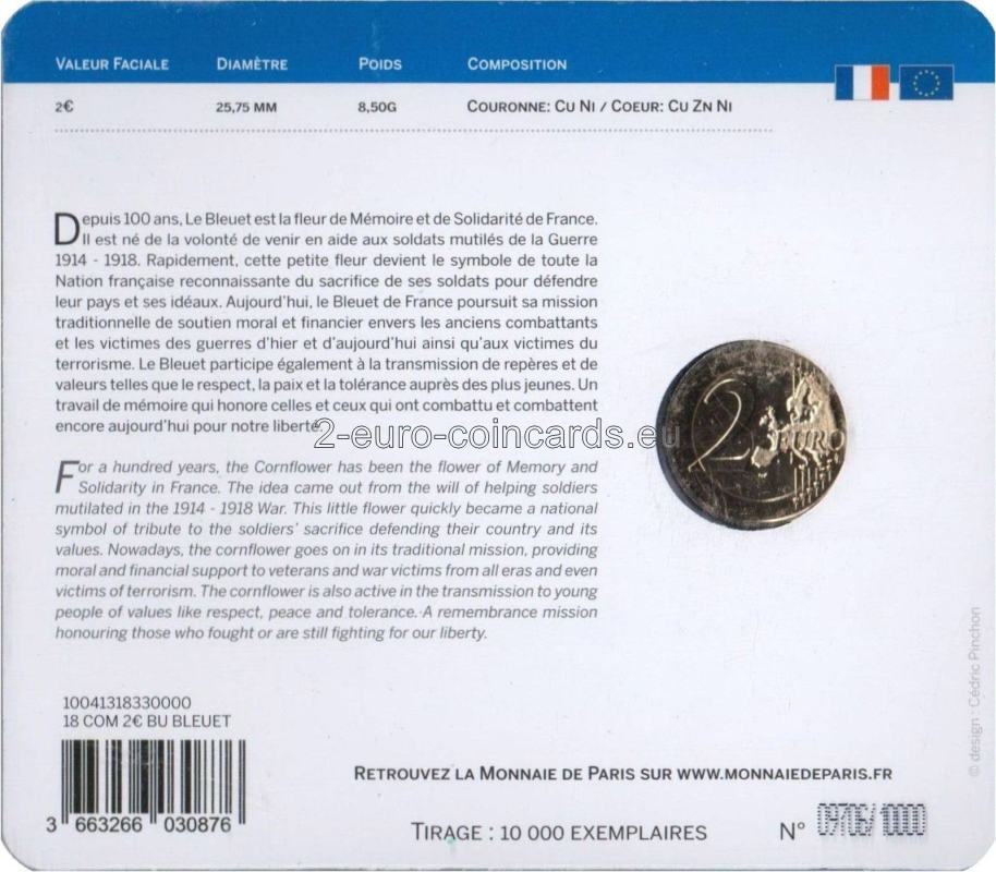 Ústredným motívom vzoru je kvet nevädze. Obkolesuje ho nápis: „Le Bleuet de France, fleur de mémoire et de solidarité“ (Francúzska nevädza, kvet pamiatky a solidarity). V spodnej časti vzoru sú uvedené dátumy „1918 – 2018“, iniciály „RF“ a značky parížskej mincovne Monnaie de Paris (roh hojnosti) a hlavného rytca Yvesa Sampa (päťuholník).