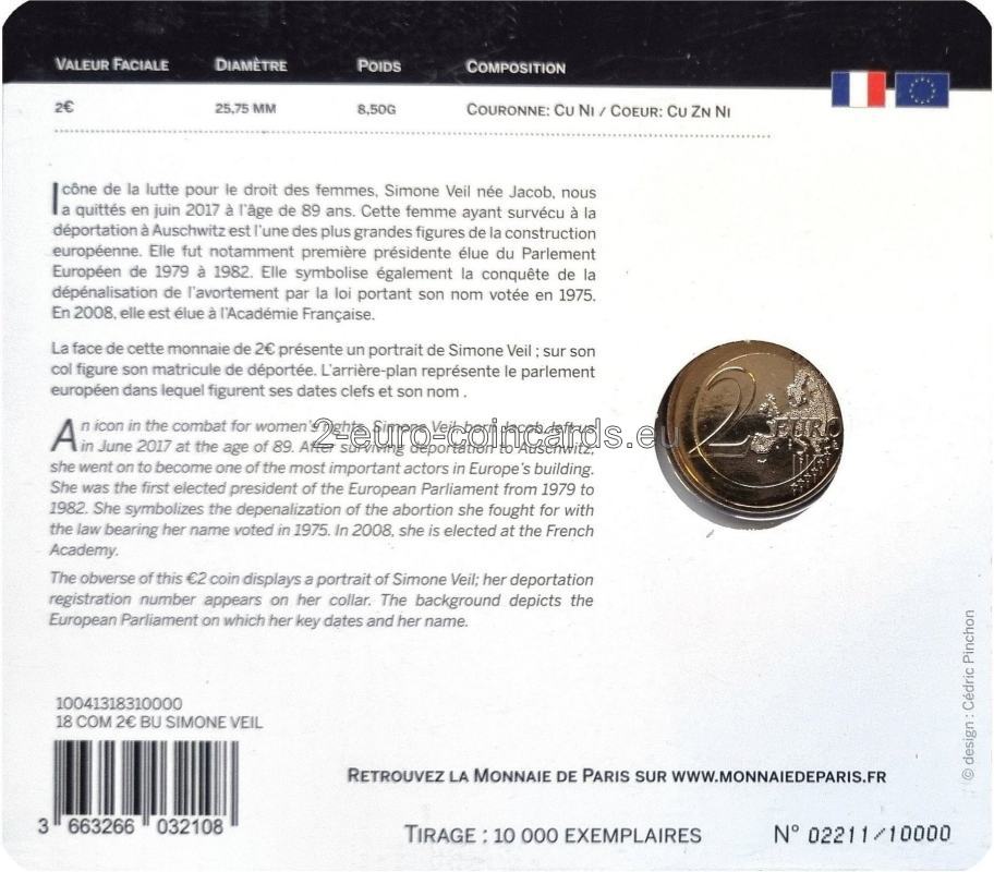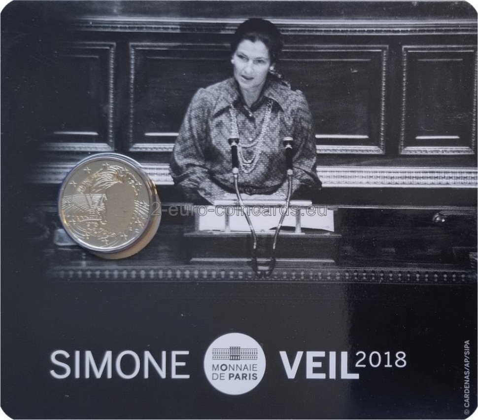 Ikona boja za práva žien. Simone Veilová, rodená Jacobová, zomrela v júni 2017 vo veku 89 rokov. Táto žena, ktorá prežila deportáciu do Osvienčimu, bola jednou z najväčších osobností budovania Európy. V rokoch 1979 až 1982 bola prvou zvolenou predsedníčkou Európskeho parlamentu. Symbolizuje aj vybojovanie dekriminalizácie potratov prostredníctvom zákona nesúceho jej meno, ktorý bol prijatý v roku 1975. V roku 2008 bola zvolená za členku Francúzskej akadémie. Na prednej strane tejto mince v hodnote 2 € je portrét Simone Veilovej s číslom jej deportácie na hlave. Na pozadí je zobrazený Európsky parlament s kľúčovými dátumami a jej meno.