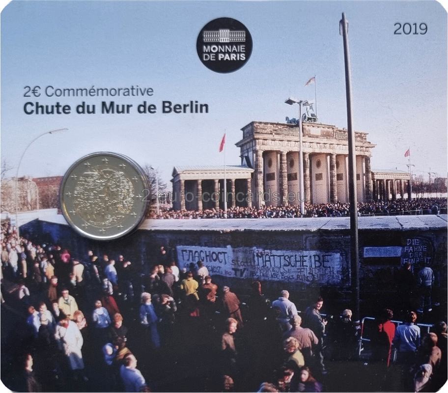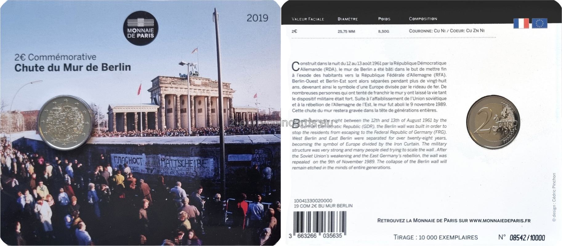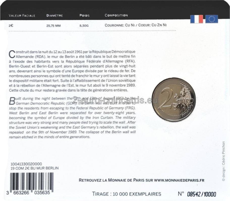 Na minci je vyobrazený Berlínsky múr s otvorom uprostred, ktorým prelietajú holubice (alegória medzinárodného uzmierenia) a prechádza oslavujúci dav. V pozadí sa nachádza Brandenburská brána, ktorá je typickým symbolom Berlína. Na jednej strane múru je nápis „30. výročie pádu Berlínskeho múru/30 Jahre Mauerfall“. V spodnej časti návrhu je uvedený rok vydania „2019“ a napravo označenie vydávajúcej krajiny „RF“ (République Française). V spodnej časti sú značky parížskej mincovne Monnaie de Paris (roh hojnosti) a hlavného rytca Yvesa Sampa (päťuholník).