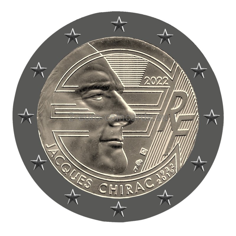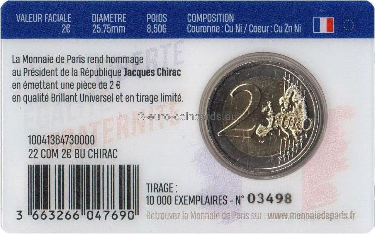 Monnaie de Paris vzdáva hold francúzskemu prezidentovi Jacquesovi Chiracovi vydaním mince v hodnote 2 € v kvalite BU v limitovanej edícii.