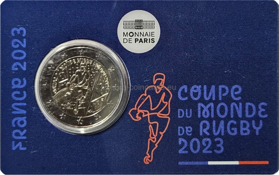 Na minci je vyobrazený štylizovaný ragbista, ktorý prihráva spoluhráčovi. V pozadí sa nachádza ihrisko v podobe zemegule, na ktorom sú umiestnené ragbyové bránky. Vyobrazenie je súčasťou imaginárnej ragbyovej galaxie a planét oválneho tvaru. Vedľa hráča sa nachádza logo súťaže, zatiaľ čo jej názov je uvedený okolo vyobrazenia. Pod ním je vpravo uvedené označenie vydávajúcej krajiny „RF“, značka mincovne a značka rytca. Vľavo sa nachádza názov súťaže, vydávajúca krajina „FRANCÚZSKO“ a rok „2023“. Názov súťaže a označenie „RF“ sú napísané v oficiálnom písme podujatia, ktoré sa nazýva Mobius.