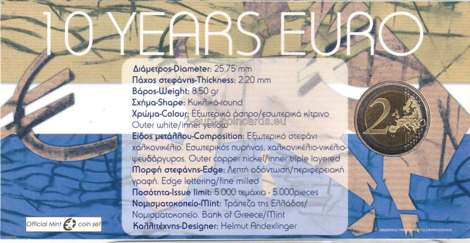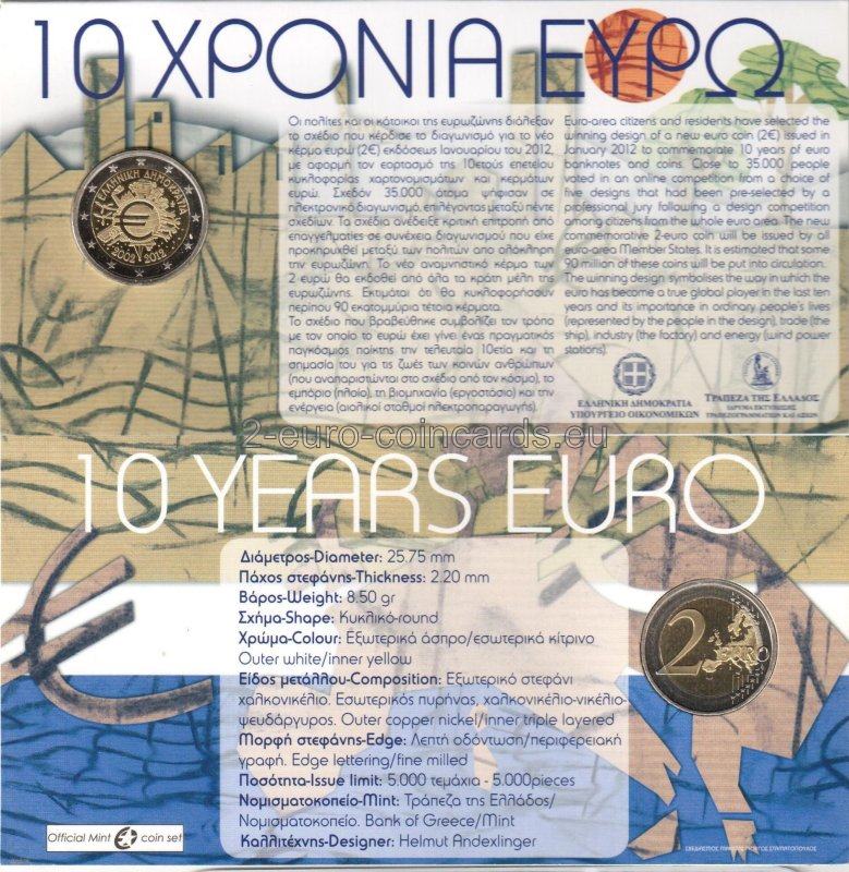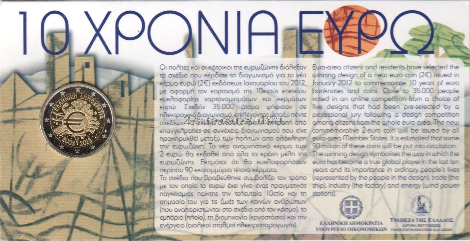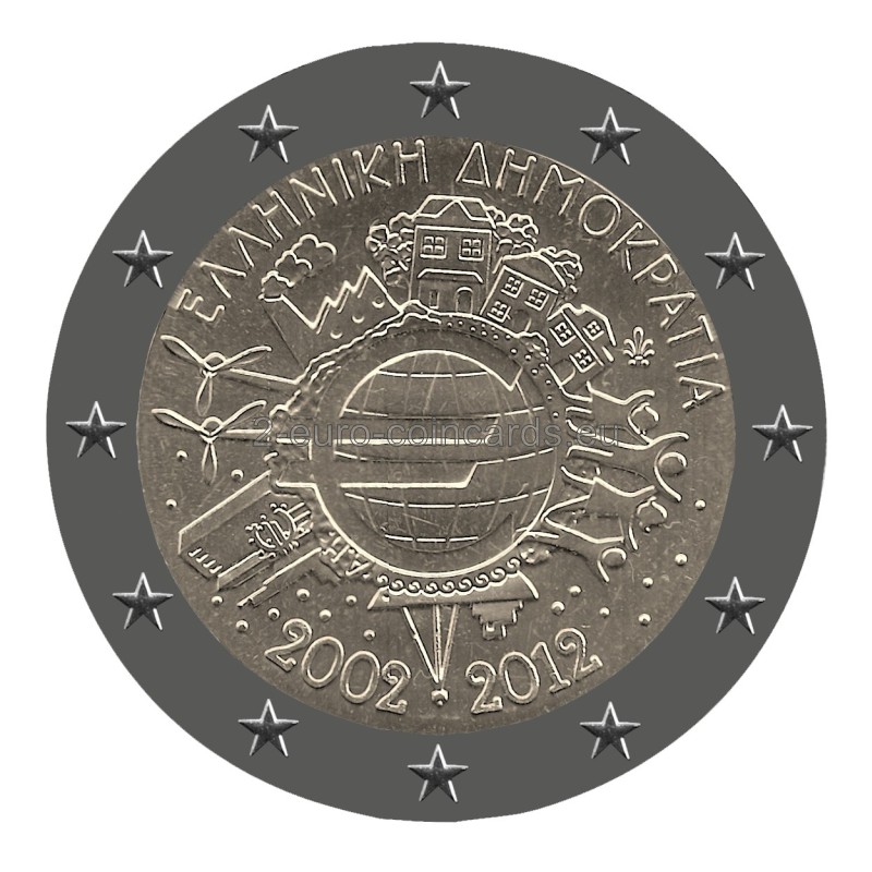 Znak eura v strede mince znamená, že euro sa stalo mimoriadne dôležitou súčasťou Európy, ale aj sveta, pretože sa v priebehu posledných 10 rokov stalo globálnym hráčom v rámci medzinárodného menového systému. Jednotlivé prvky motívu okolo symbolu eura na minci vyjadrujú význam eura pre ľudí, pre finančný svet (veža ECB), pre obchod (lode), priemysel (továrne), pre odvetvie energetiky, výskumu a vývoja (veterné elektrárne). Iniciály autora návrhu „A.H.“ sa dajú objaviť (ak sa pozriete veľmi pozorne) medzi loďou a budovou Eurotower. Pozdĺž horného okraja vnútornej časti mince je uvedená názov krajiny vydania „ΕΛΛΗΝΙΚΗ ΔΗΜΟΚΡΑΤΙΑ“ (HELÉNSKA REPUBLIKA), zatiaľ čo letopočty „2002 – 2012“ sú umiestnené v dolnej časti. Vpravo sa nachádza značka Gréckej štátnej mincovne (palmeta z akantových listov).