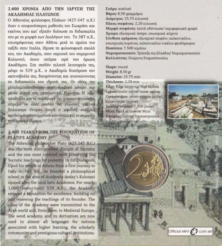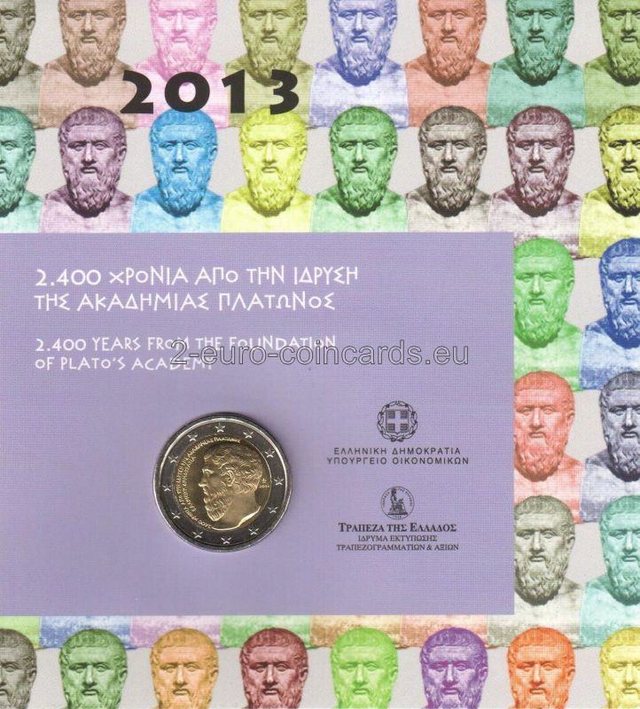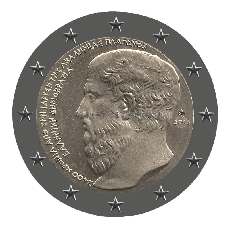 Motív znázorňuje Platónov portrét z profilu. Vľavo sa nachádzajú nápisy v starej gréčtine: „2400 ΧΡΟΝΙΑ ΑΠΟ ΤΗΝ ΙΔΡΥΣΗ ΤΗΣ ΑΚΑΔΗΜΙΑΣ ΠΛΑΤΩΝΟΣ“ (2400 rokov od založenia Platónovej akadémie) a „ΕΛΛΗΝΙΚΗ ΔΗΜΟΚΡΑΤΙΑ“ (HELÉNSKA REPUBLIKA). Vpravo sa nachádza letopočet „2013“ a značka Gréckej štátnej mincovne (palmeta-ornament z listov akanty). Monogram autora George Stamatopoulosa, „ΣΤΑΜ“, sa nachádza na druhej strane.