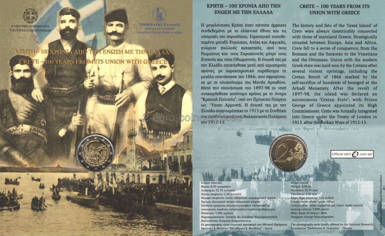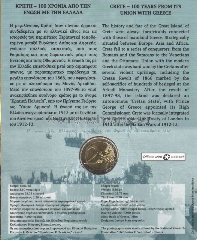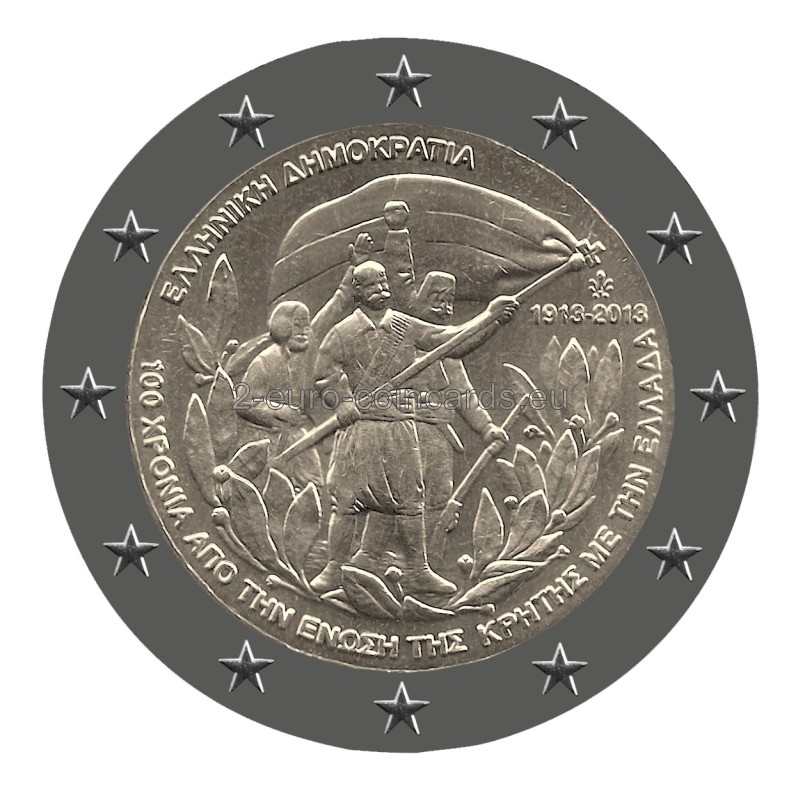 Vo vnútornej časti mince sú znázornení krétski vzbúrenci držiaci vztýčenú grécku vlajku symbolizujúc tak boj Kréty o zjednotenie s Gréckom. Vo vrchnej časti je veľkými písmenami oblúkom napísaný názov vydávajúcej krajiny v gréčtine: „ΕΛΛΗΝΙΚΗ ΔΗΜΟΚΡΑΤΙΑ“ (HELÉNSKA REPUBLIKA). V spodnej časti sa nachádza nápis v gréčtine: „100 ΧΡΟΝΙΑ ΑΠΟ ΤΗΝ ΕΝΩΣΗ ΤΗΣ ΚΡΗΤΗΣ ΜΕ ΤΗΝ ΕΛΛΑΔΑ“ (100 rokov zjednotenia Kréty a Grécka). Vpravo sú letopočty „1913 – 2013“ a značka Gréckej štátnej mincovne (palmeta-ornament z listov akanty). Na druhej strane sa nachádza „ΣΤΑΜ“, značka autora George Stamatopoulosa.