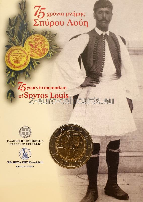 Vzor znázorňuje Spyrosa Louisa,víťaza OH 1896 a pohár, ktorý získal. V pozadí je vyobrazený Panaténsky štadión. Pozdĺž okraja vnútornej časti mince je vypísaný v gréčtine názov vydávajúcej krajiny „ΕΛΛΗΝΙΚΗ ΔΗΜΟΚΡΑΤΙΑ“ (HELÉNSKA REPUBLIKA a nápis „75 ΧΡΟΝΙΑ ΜΝΗΜΗΣ ΣΠΥΡΟΥ ΛΟΥΗ“ (75 ROKOV OD ÚMRTIA SPYROSA LOUISA). Nad pohárom je uvedený rok vydania „2015“ a napravo od pohára sa nachádza značka Gréckej štátnej mincovne (palmeta-ornament z listov akanty). V spodnej časti vzoru sa nachádza „ΣΤΑΜ“, značka autora George Stamatopoulosa.