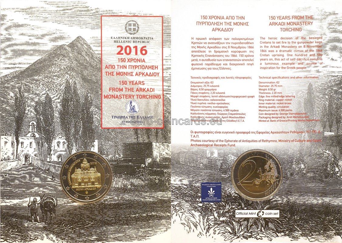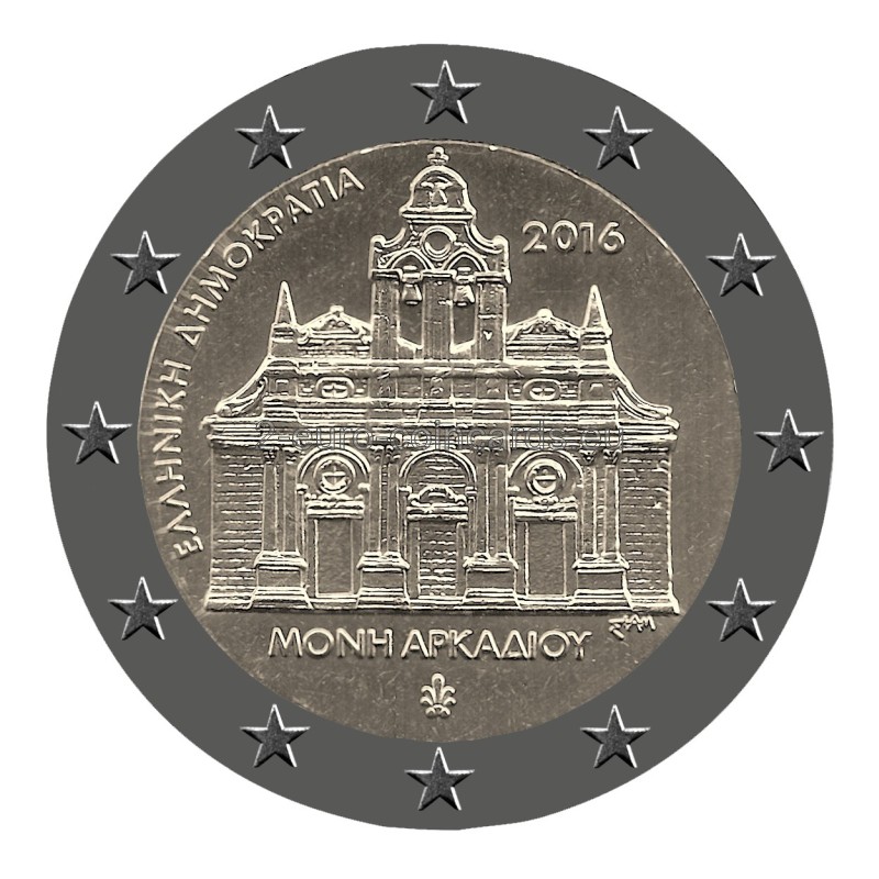 Motív zobrazuje kláštor Arkadi. V strede je nápis v gréčtine „ΜΟΝΗ ΑΡΚΑΔΙΟΥ“ (KLÁŠTOR ARKADI) a pozdĺž okraja vnútornej časti mince vľavo nápis v gréčtine „ΕΛΛΗΝΙΚΗ ΔΗΜΟΚΡΑΤΙΑ“ (HELÉNSKA REPUBLIKA). Vpravo hore je uvedený rok vydania „2016“ a pod nápisom v strede sa nachádza značka gréckej štátnej mincovne (palmeta-ornament z listov akanty). V dolnej časti vpravo sa nachádza „ΣΤΑΜ“, značka autora George Stamatopoulosa.