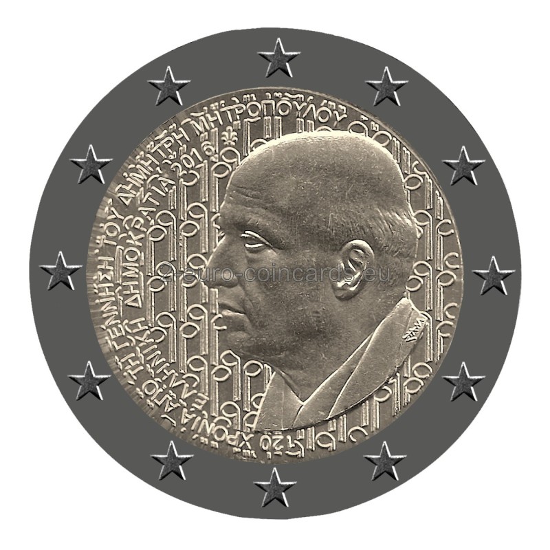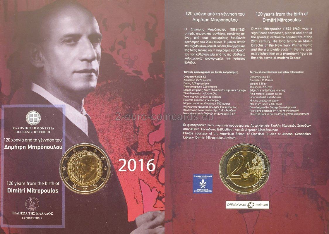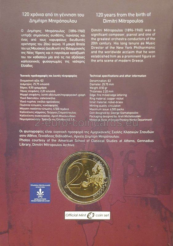 Na minci je portrét Dimitriho Mitropoulosa na pozadí hudobných nôt. Pozdĺž ľavého vnútorného okraja mince sú v gréčtine uvedené nápisy „120 ΧΡΟΝΙΑ ΑΠΟ ΤΗ ΓΕΝΝΗΣΗ ΤΟΥ ΔΗΜΗΤΡΗ ΜΗΤΡΟΠΟΥΛΟΥ“ (120. VÝROČIE NARODENIA DIMITRIHO MITROPOULOSA) a „ΕΛΛΗΝΙΚΗ ΔΗΜΟΚΡΑΤΙΑ“ (HELÉNSKA REPUBLIKA). V ľavej hornej časti mince sa nachádza rok vydania „2016“ a značka gréckej štátnej mincovne (palmeta-ornament z listov akanty). Vpravo dole sa nachádza značka autora George Stamatopoulosa (ΣΤΑΜ).