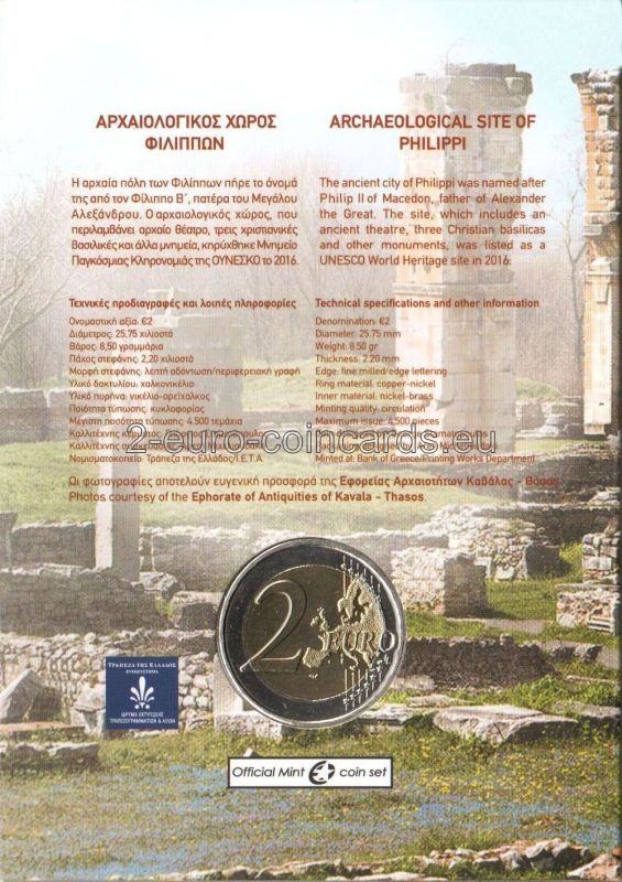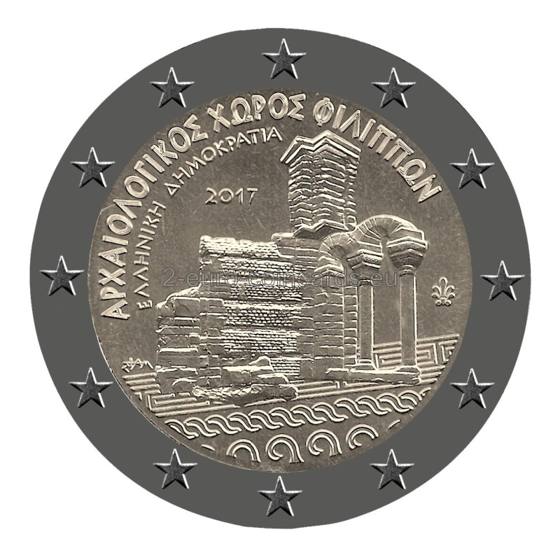 Vzor zobrazuje časť Baziliky B a lineárne motívy inšpirované pohraničným vzorom z antickej gréckej mozaiky, ktorá bola objavená na nálezisku. Pozdĺž vnútorného kruhu mince sú vyryté nápisy v gréčtine „ΑΡΧΑΙΟΛΟΓΙΚΟΣ ΧΩΡΟΣ ΦΙΛΙΠΠΩΝ“ (ARCHEOLOGICKÉ NÁLEZISKO PHILIPPI) a „ΕΛΛΗΝΙΚΗ ΔΗΜΟΚΡΑΤΙΑ“ (HELÉNSKA REPUBLIKA). V pozadí je takisto vyrytý rok vydania mince „2017“ a napravo sa nachádza značka gréckej štátnej mincovne (palmeta-ornament z listov akanty). Vľavo dole sa nachádza „ΣΤΑΜ“, značka autora George Stamatopoulosa.