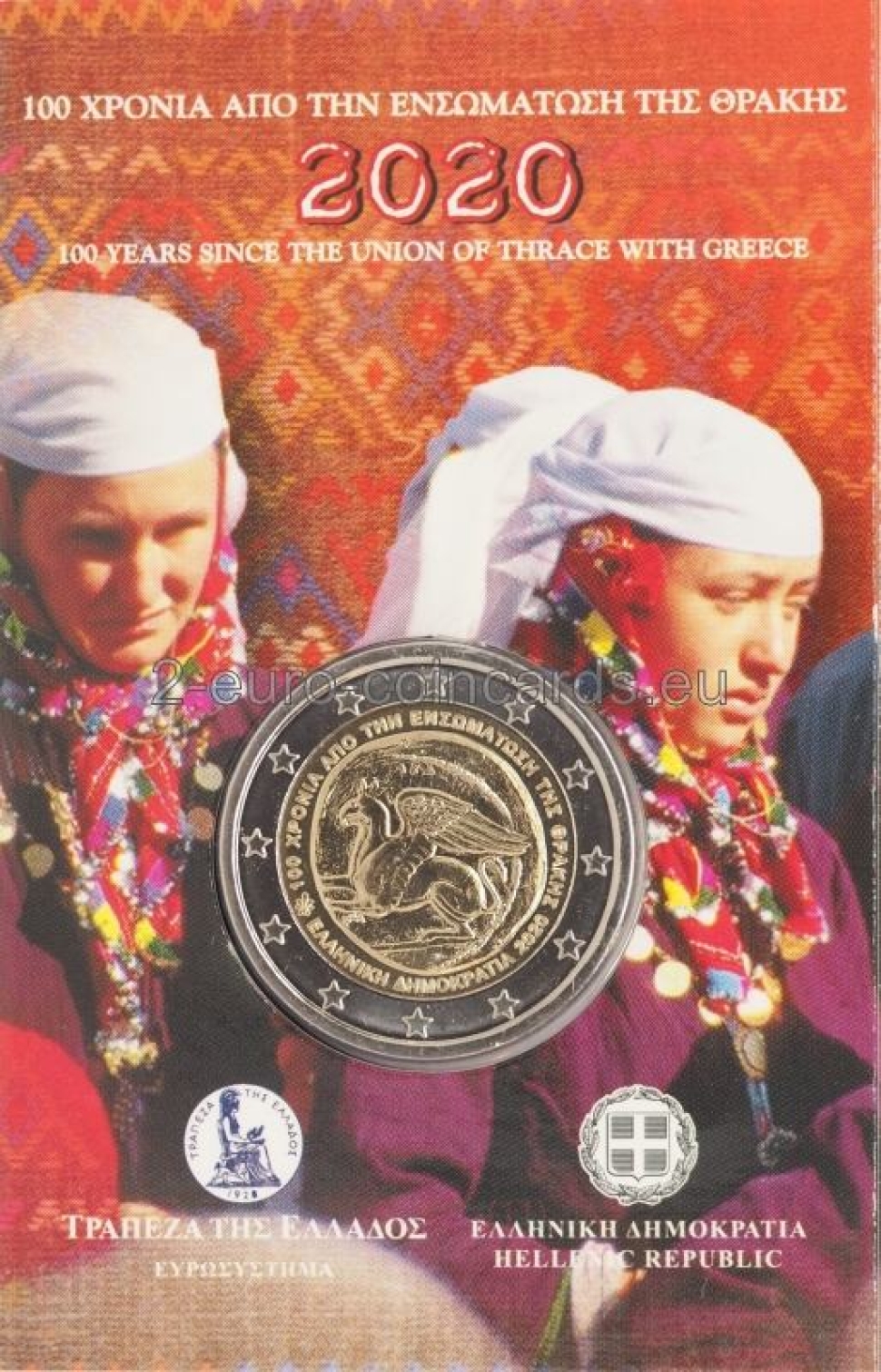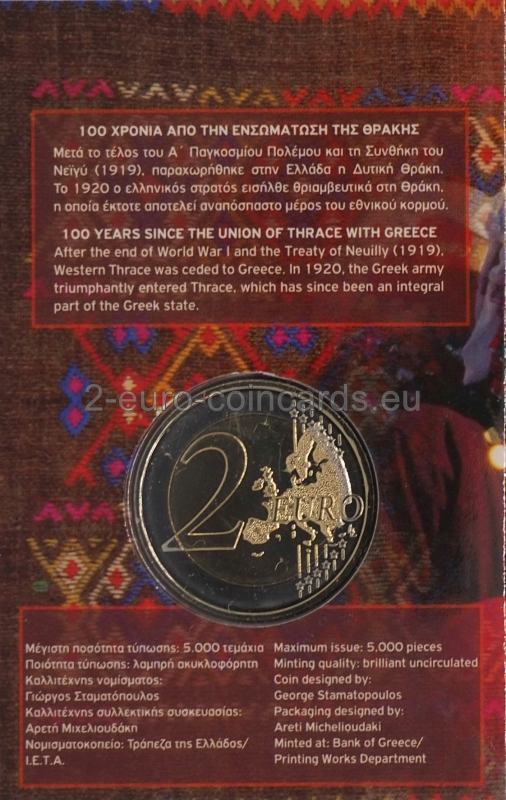 Vzor kopíruje starodávnu mincu tráckeho mesta Abdéra s gryfom (mýtické zviera s časťami tiel rôznych živočíchov). Na vnútornom okraji sú vpísané slová v gréčtine „100 ΧΡΟΝΙΑ ΑΠΟ ΤΗΝ ΕΝΣΩΜΑΤΩΣΗ ΤΗΣ ΘΡΑΚΗΣ“ (100. VÝROČIE ZJEDNOTENIA TRÁCIE S GRÉCKOM) a „ΕΛΛΗΝΙΚΗ ΔΗΜΟΚΡΑΤΙΑ“ (HELÉNSKA REPUBLIKA), ako aj rok vydania „2020“ a značka gréckej štátnej mincovne (palmeta-ornament z listov akanty). Vľavo sa nachádza značka autora George Stamatopoulosa (ΣΤΑΜ).