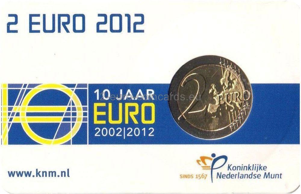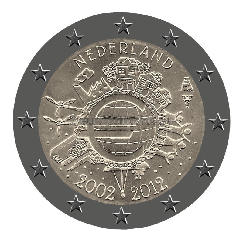 Znak eura v strede mince znamená, že euro sa stalo mimoriadne dôležitou súčasťou Európy, ale aj sveta, pretože sa v priebehu posledných 10 rokov stalo globálnym hráčom v rámci medzinárodného menového systému. Jednotlivé prvky motívu okolo symbolu eura na minci vyjadrujú význam eura pre ľudí, pre finančný svet (veža ECB), pre obchod (lode), priemysel (továrne), pre odvetvie energetiky, výskumu a vývoja (veterné elektrárne). Iniciály autora návrhu „A.H.“ sa dajú objaviť (ak sa pozriete veľmi pozorne) medzi loďou a budovou Eurotower. Pozdĺž horného okraja vnútornej časti mince je uvedená krajina vydania (NEDERLAND), zatiaľ čo označenie 2002 – 2012 je umiestnené v dolnej časti. V pravej časti sa nachádza značka rytca Maartena Brouwera (plachetnica) a značka mincovne v Utrechte (Merkúrová palica).