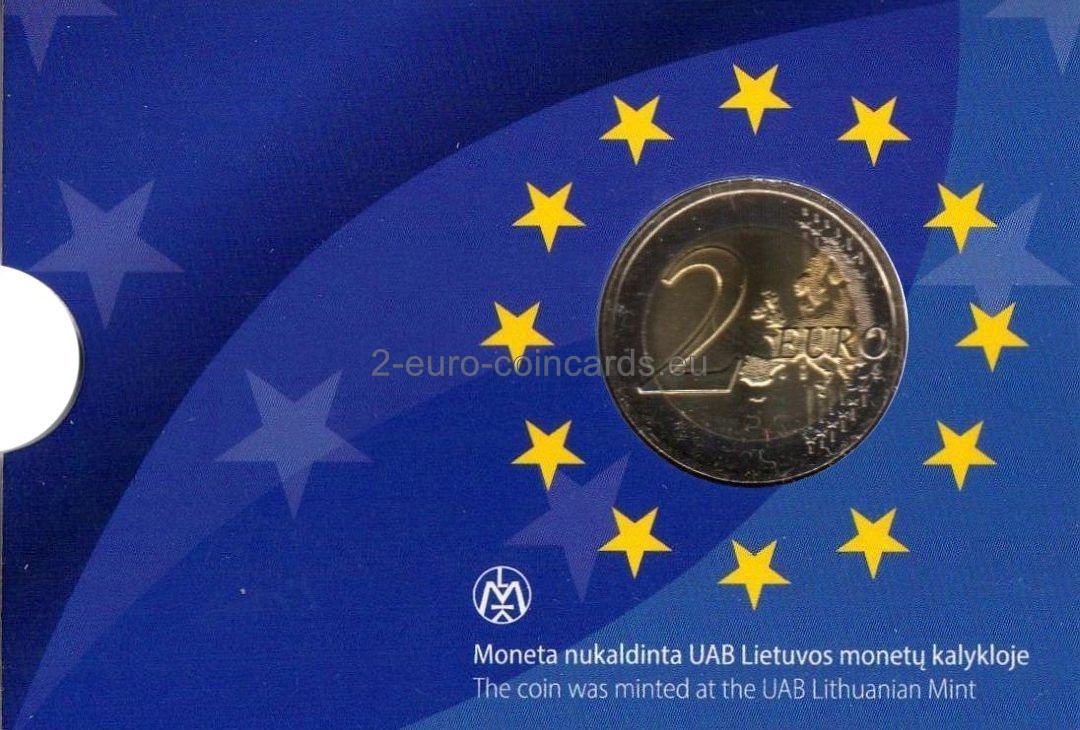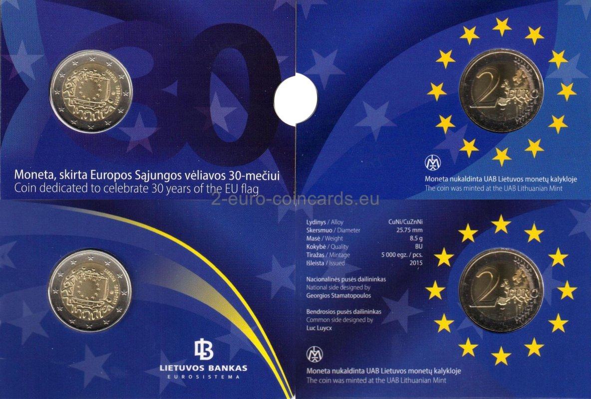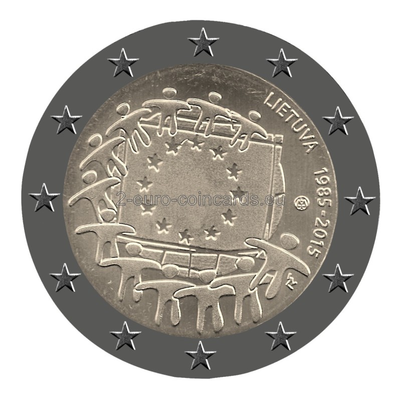 Vzor zobrazuje vlajku EÚ ako symbol, ktorý spája ľudí a kultúry s rovnakými víziami a ideálmi lepšej spoločnej budúcnosti. Dvanásť hviezd, ktoré sa menia na ľudské postavy, predstavuje zrodenie novej Európy. Vpravo hore je v polkruhu uvedený názov vydávajúcej krajiny „LIETUVA“ a roky „1985 – 2015“. Vpravo dolu sa nachádzajú iniciály umelca Georgiosa Stamatopoulosa