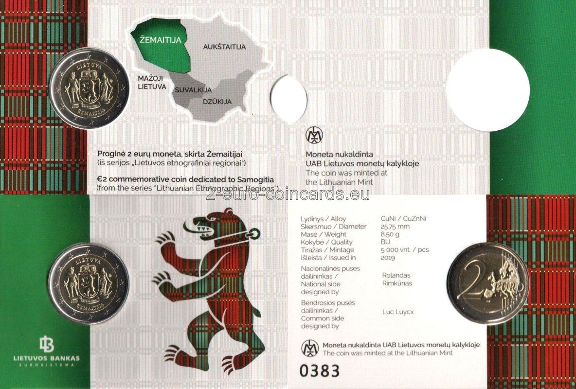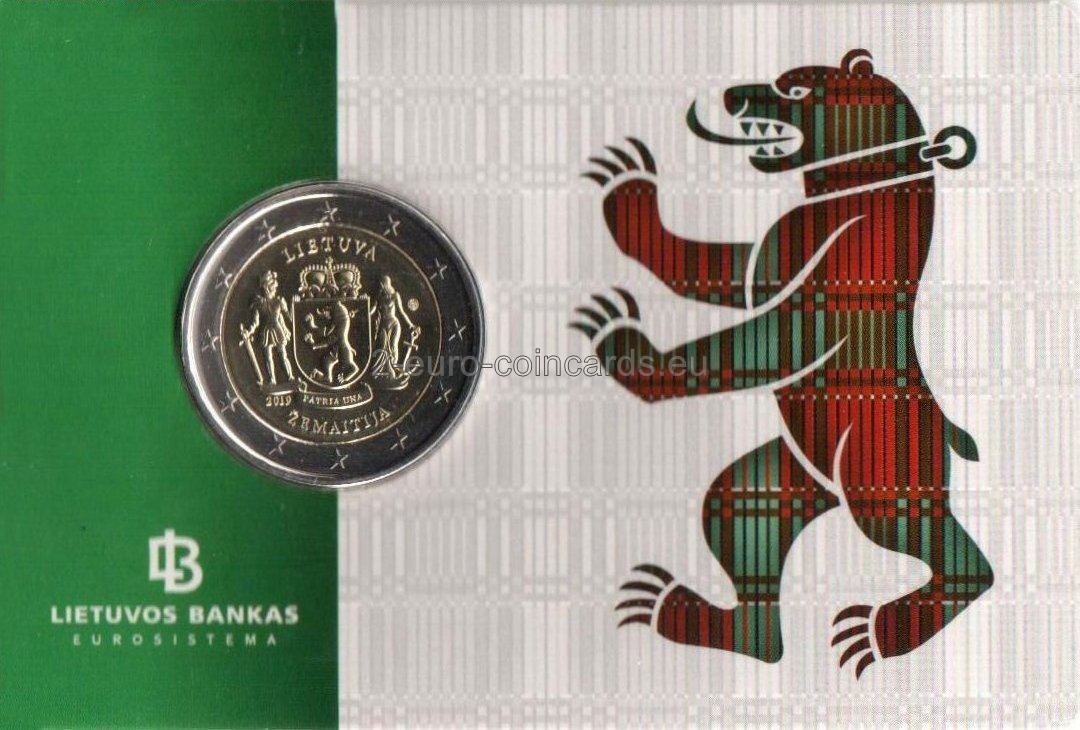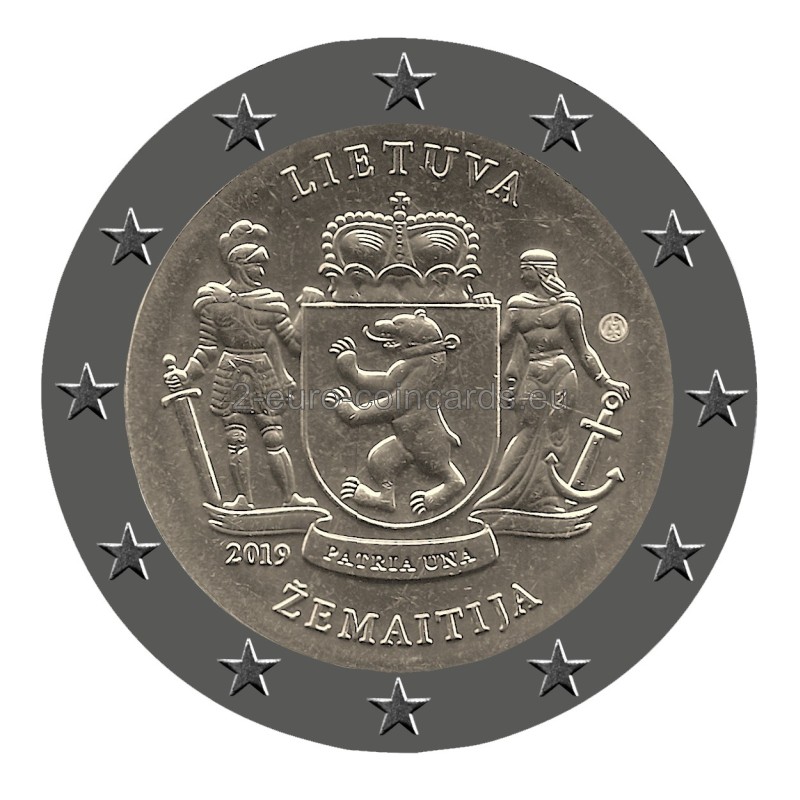 Ústredným motívom je medveď stojaci na zadných nohách, ktorý má na krku kovový obojok. Jeho podobizeň zdobí erb Žemajtska už od 16. storočia. Medveď je umiestnený na štíte, na ktorom leží koruna. Štít podopierajú vojak v brnení (symbol odvahy, obetovania sa a vlastenectva) a bohyňa držiaca kotvu (symbol nádeje). V dolnej časti sa nachádza latinský nápis „PATRIA UNA“ (jedna vlasť). Motív obklopujú nápisy „LIETUVA“ (Litva) a „ŽEMAITIJA“ (Žemajtsko), rok vydania „2019“ a značka litovskej mincovne.
