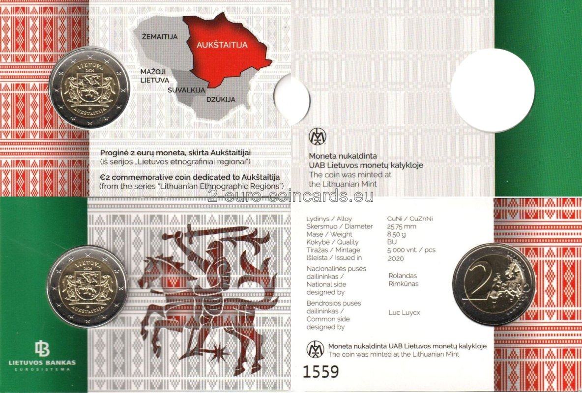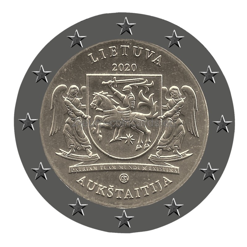 Na vzore je zobrazený štátny znak a rytier v brnení, ktorý v pravej ruke drží meč. Štátny znak držia dvaja anjeli, ktorí symbolicky vyzdvihujú a ochraňujú región Aukštaitija – jeden z najvýznamnejších regiónov Litvy a kolískou jej štátnosti. Pod obrázkom je latinský nápis „PATRIAM TUAM MUNDUM EXISTIMA“ (POVAŽUJ SVOJU VLASŤ ZA CELÝ SVET). Okolo vzoru sú tieto nápisy: „LIETUVA“ (názov vydávajúcej krajiny), „AUKŠTAITIJA“, rok vydania „2020“ a značka litovskej mincovne.