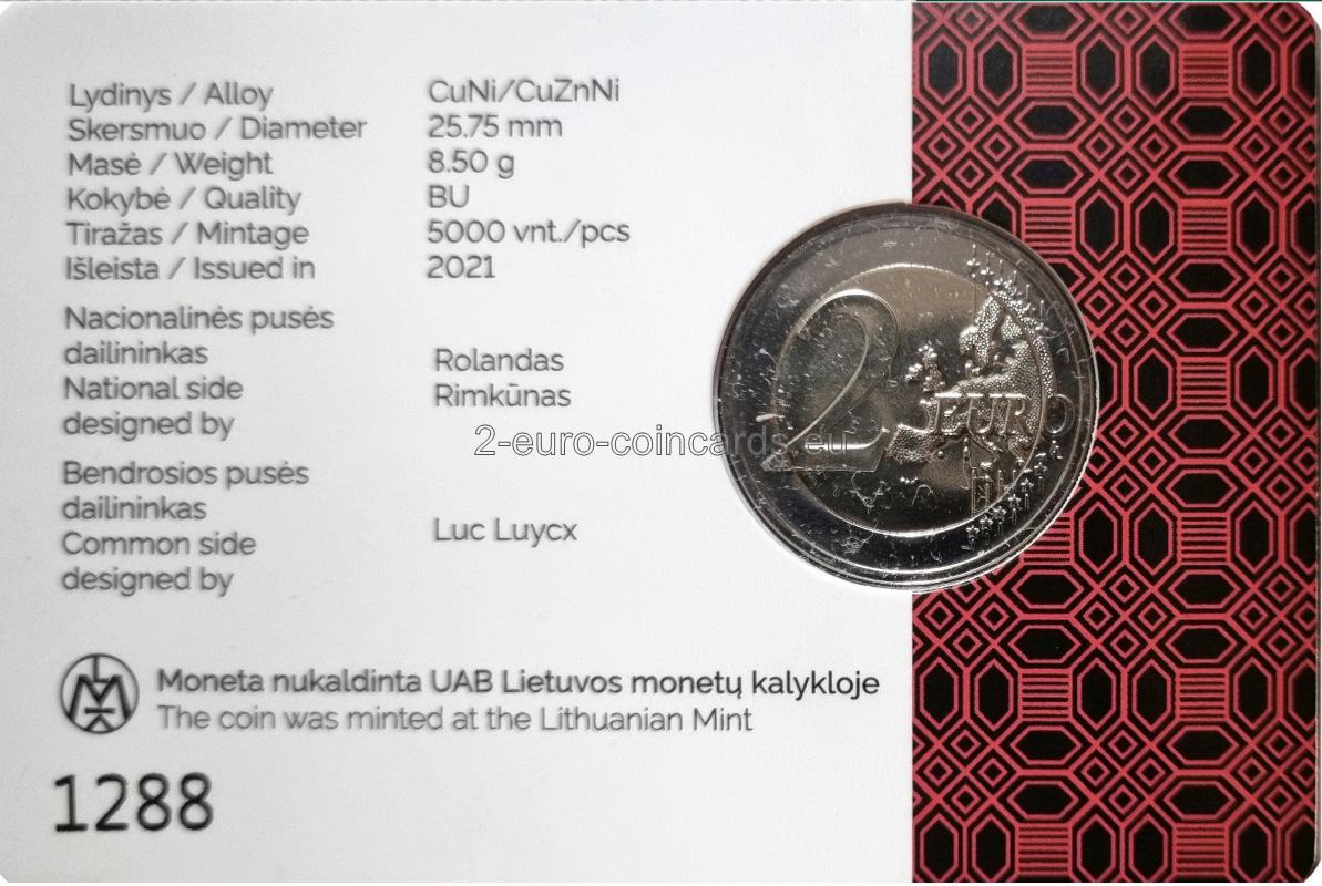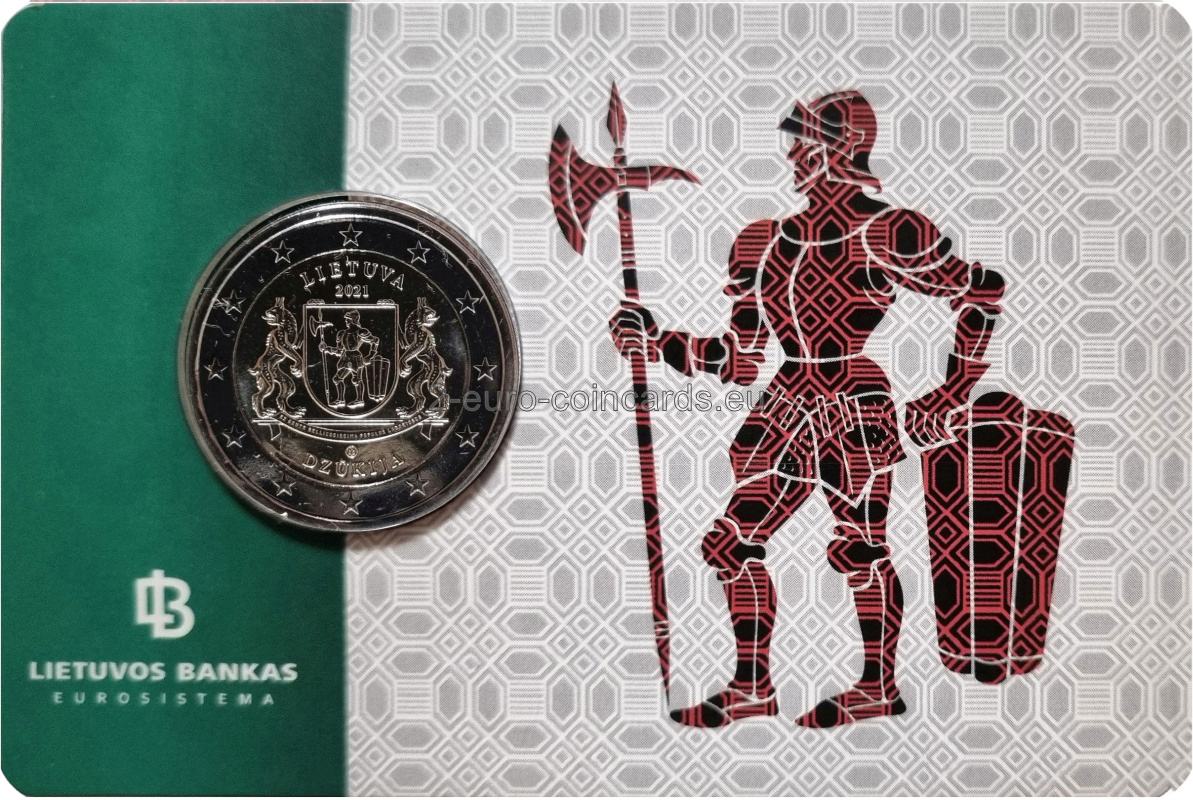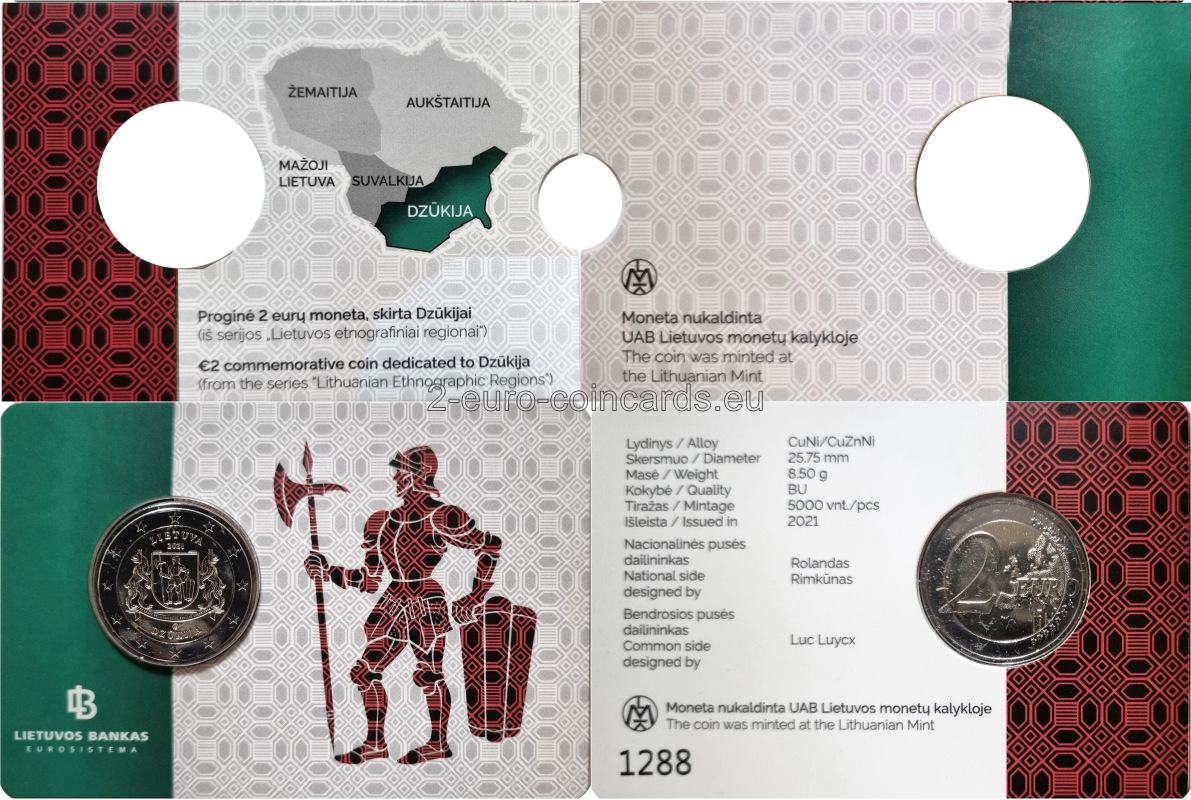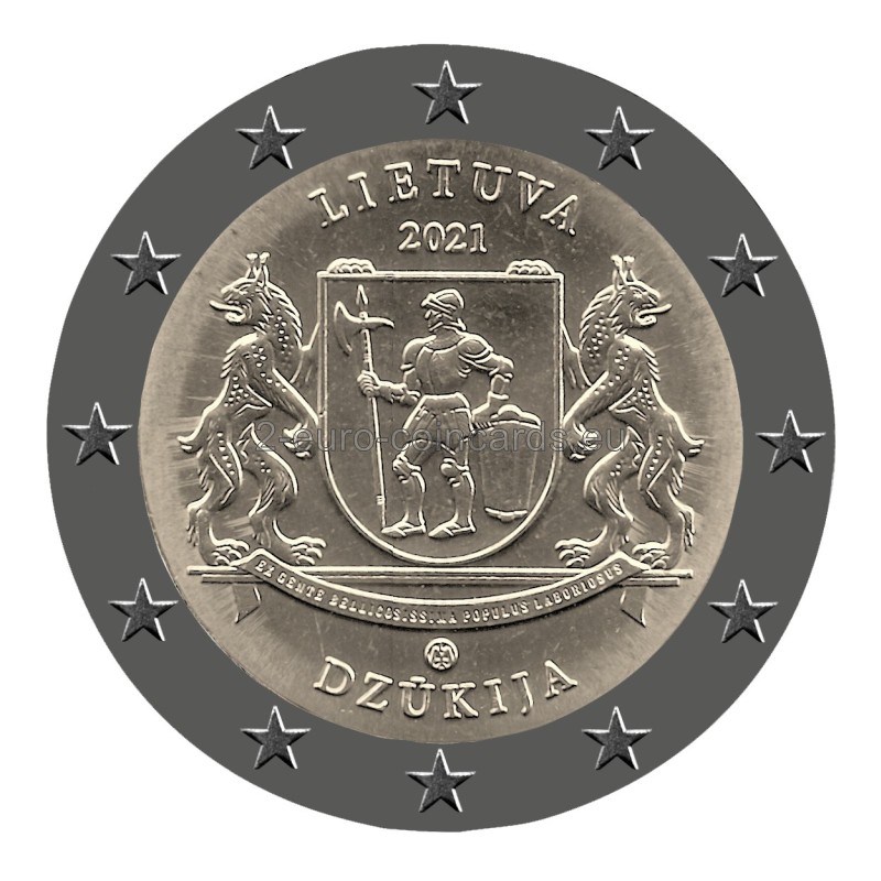 Na minci je vyobrazený erb s vojakom v brnení, ktorý v pravej ruke zviera halapartňu a ľavou rukou sa opiera o strieborný baltský štít. Erb umiestnený na nosníku držia dva rysy. Pod erbom je stuha s latinským nápisom „EX GENTE BELICOSISSIMA POPULUS LABORIOSUS“ (PRACOVITÍ ĽUDIA BOJOVNÉHO KMEŇA). Okolo vzoru sú nápisy LIETUVA (LITVA) a DZŪKIJA, rok vydania (2021) a značka litovskej mincovne. Autorom vzoru je Rolandas Rimkūnas.
