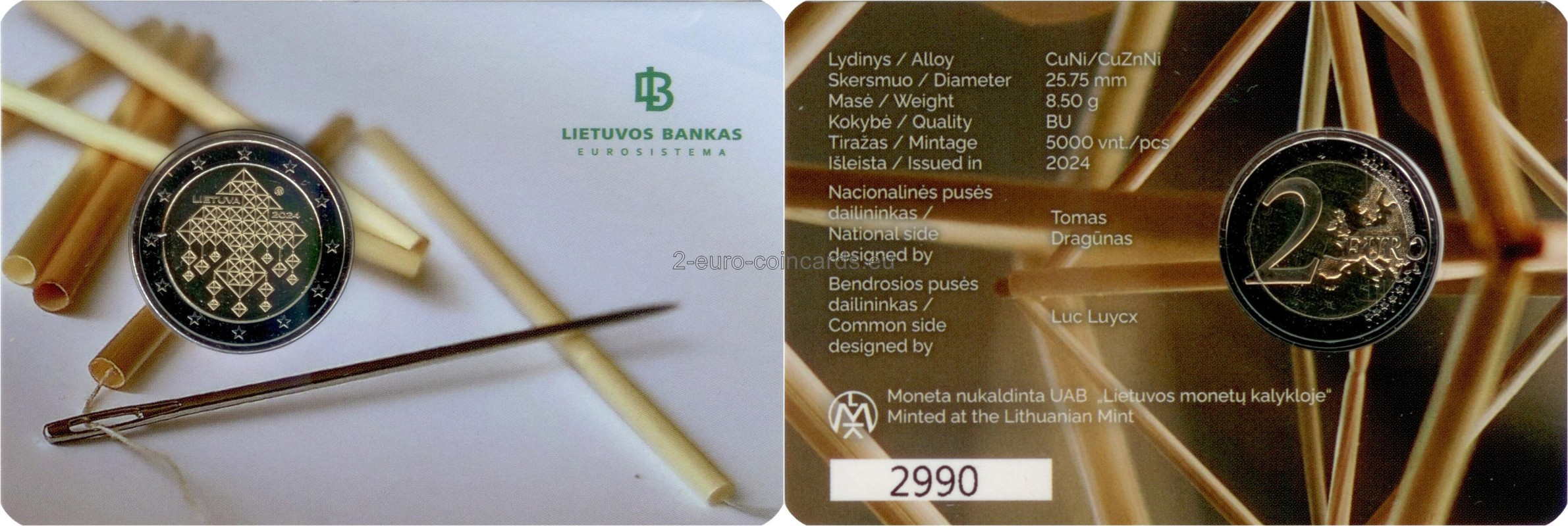 Pamätná minca je venovaná litovskej tradícii slamených dekorácii, ktorá bola koncom roka 2023 zapísaná do Reprezentatívneho zoznamu nehmotného kultúrneho dedičstva ľudstva UNESCO. Ide o štvrtú litovskú kultúrnu tradíciu, ktorá bola zapísaná do tohto zoznamu UNESCO. Slamené dekorácie sú geometricky tvarované diely vyrobené zo suchej ražnej, pšeničnej slamy alebo iných rastlinných vlákien. Pšeničná slama sa na niť navíja do tvaru trojuholníkov a štvorcov. Tieto geometrické tvary nie sú zvolené svojvoľne. V starovekých kultúrach predstavovali trojuholníky ducha a štvorce hmotu. Práve ich kombinácia vytvára dekoráciu. Slamené dekorácie majú viac symbolických významov. Už dávno je známe, že slamené dekorácie sú veľmi dôležitou súčasťou nášho národa a že slama sprevádza ľudí už od detstva. V minulosti sa slamené dekorácie vešali nad kolísku dieťaťa. Dekorácie sa vyrábali aj pri príprave na veľké sviatky roka - Vianoce a Veľkú noc - a vešali sa na povalu, aby vytvorili sviatočný priestor harmónie, krásy a poriadku okolo stola. Slamené dekorácie sa dávali aj ako svadobný dar pre novovznikajúcu rodinu.