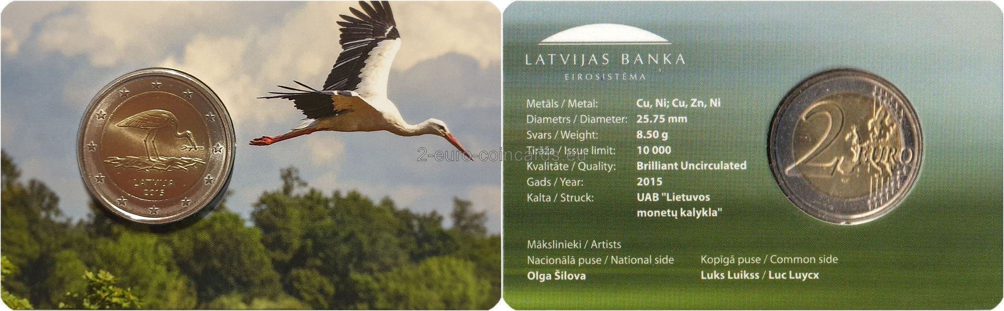 Na vzore je znázornený bocian čierny (Ciconia nigra), ktorý je jedným z druhov považovaných za symboly ochrany prírody v Európe. V dolnej časti vzoru sa nachádza názov vydávajúcej krajiny „LATVIJA“ a pod ním je uvedený rok vydania „2015“.