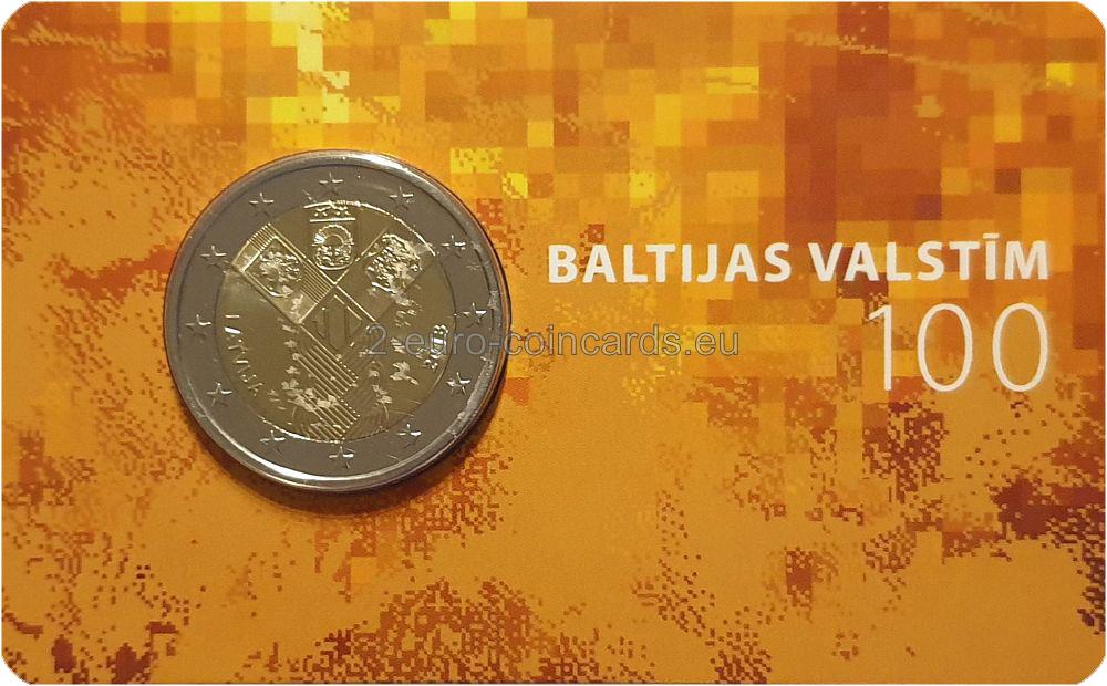 Estónsko, Lotyšsko a Litva v roku 2018 spoločne vydali pamätnú eurovú mincu so spoločným motívom, ktorou sa pripomína vznik estónskeho štátu a lotyšského štátu a obnovenie litovského štátu. Tri pobaltské štáty sú symbolicky znázornené vo forme vrkoča. Spája ich história: spoločná minulosť, súčasnosť a budúcnosť. Súčasťou motívu je aj štylizovaná číslica predstavujúca 100. výročie a heraldické symboly všetkých troch štátov. Na ľavej strane sa nachádza názov vydávajúcej krajiny „LATVIJA“ a značka mincovne, na pravej strane rok vydania „2018“ a značka autora návrhu „JP“. Tento návrh bol vybraný na základe verejného hlasovania vo všetkých troch pobaltských krajinách.