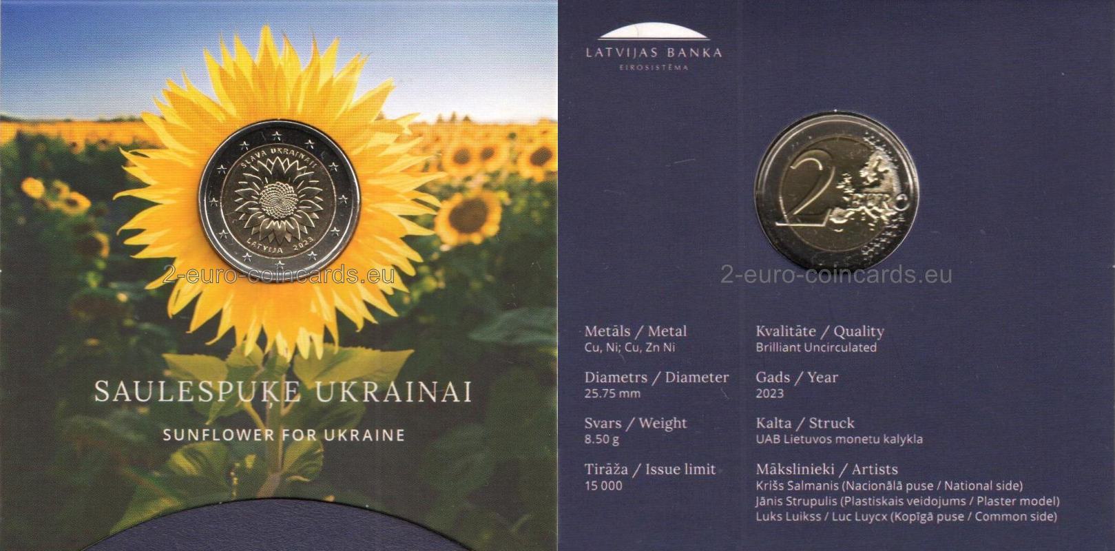 V hornej časti je v polkruhu uvedený nápis „SLAVA UKRAINAI!“ (Sláva Ukrajine) a v dolnej časti v polkruhu sa uvádza názov vydávajúcej krajiny „LATVIJA“ (Lotyšsko), za ktorým nasleduje rok vydania mince „2023“. Autorom návrhu je lotyšský umelec Krišs Salmanis.