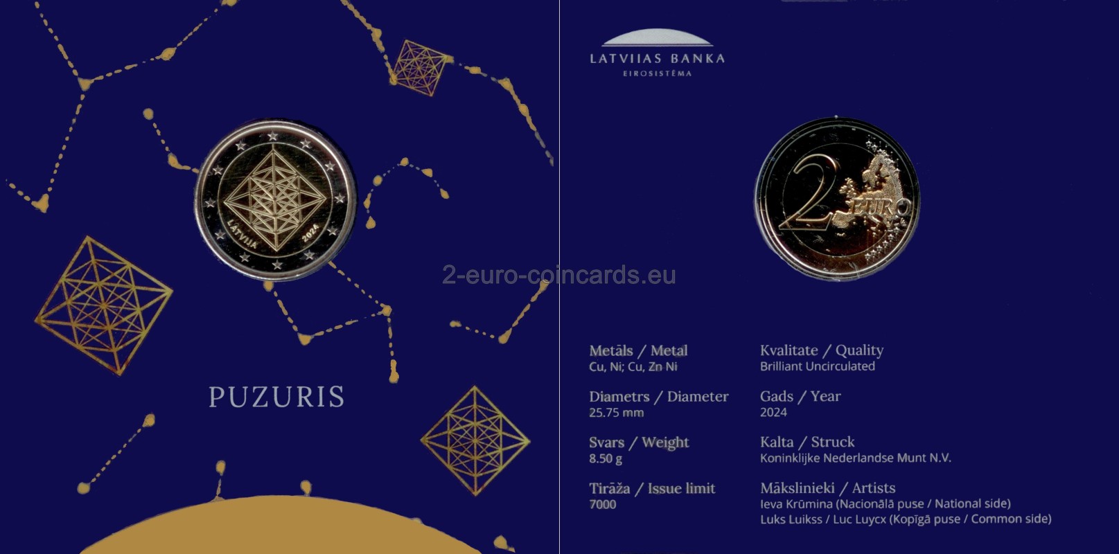 V strede mince sa nachádza dômyselne spracovaná slamená dekorácia v tvare osemstena, ktorý je tvorený 12 spojenými slamkami a symbolizuje rok s 12 mesiacmi; vľavo dole je nápis „LATVIJA“ a vpravo rok vydania „2024“.