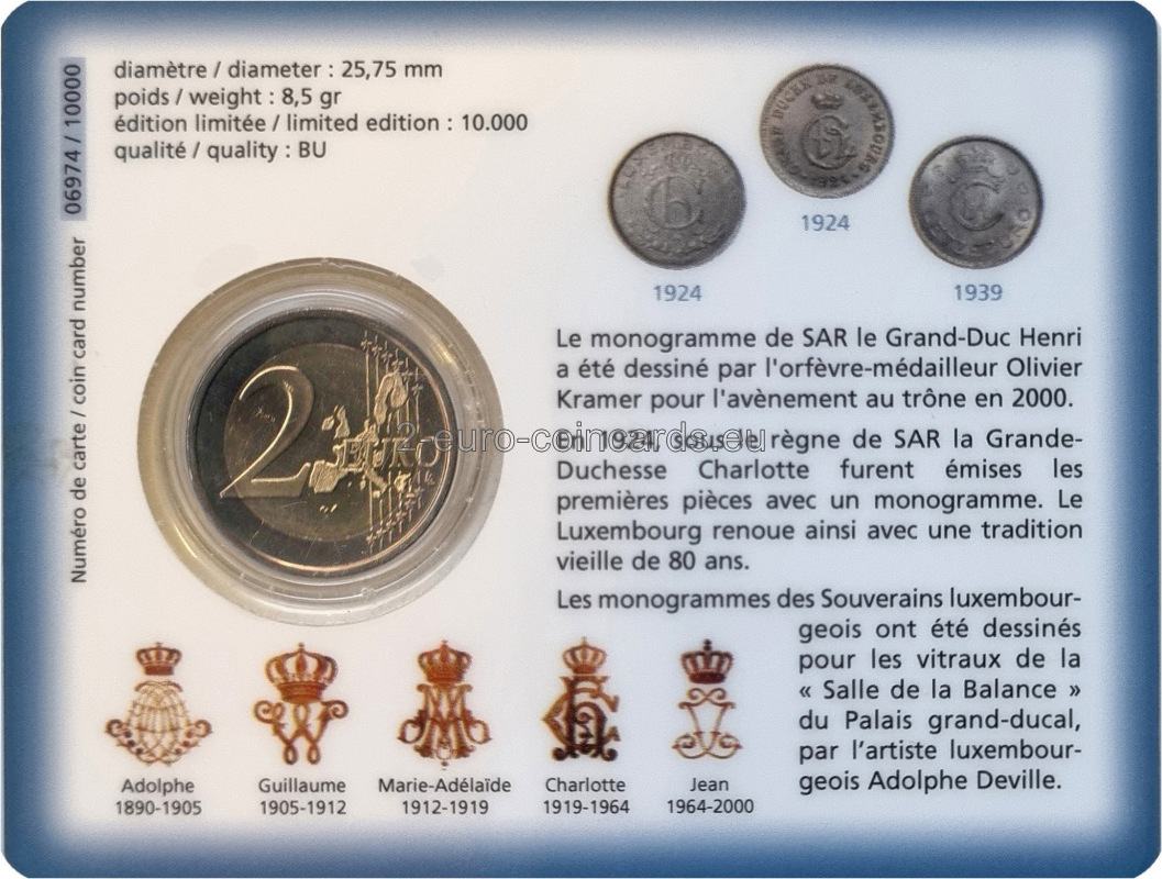 Od roku 2004 vydáva Luxembursko v rámci svojich pamätných mincí numizmatickú sériu "Veľkovojvodská dynastia" venovanú monarchii a rôznym štátnym symbolom. V roku 1924, za vlády veľkovojvodkyne Šarloty, boli v Luxembursku prvýkrát vyrazené mince s osobným monogramom panovníka. Po 80 rokoch bolo rozhodnuté oživiť túto tradíciu na novej minci. Monogram veľkovojvodu Henricha s písmenom "H" a veľkovojvodskou korunou nad ním navrhol zlatník a medailér Olivier Kramer pre korunováciu v roku 2000. Treba poznamenať, že pri razbe mincí v roku 2004 bola použitá špeciálna technológia (hĺbkotlač), ktorá bola pôvodne vyvinutá špeciálne na ochranu papierových bankoviek. Túto technológiu vyvinula Kráľovská holandská mincovňa v spolupráci s rakúskou spoločnosťou "Jura JSP" na ochranu mincí a a nazýva sa "Minted Security Printing". Je založená na mikrotexte vytlačenom na minci pomocou vysoko presného laserového gravírovania. Razba mincí touto technológiou je veľmi výnimočná, pretože takýto druh bezpečnostnej tlače sa v histórii mincovníctva ešte nevyskytol. Monogram veľkovojvodu Henricha je na minci vyobrazený mikrotlačou - šikmým písmenom "H". Ďalšou zvláštnosťou je, že mikrotext na minciach UNC a Proof je sklonený doľava, zatiaľ čo pri minciach BU je sklonený vpravo.