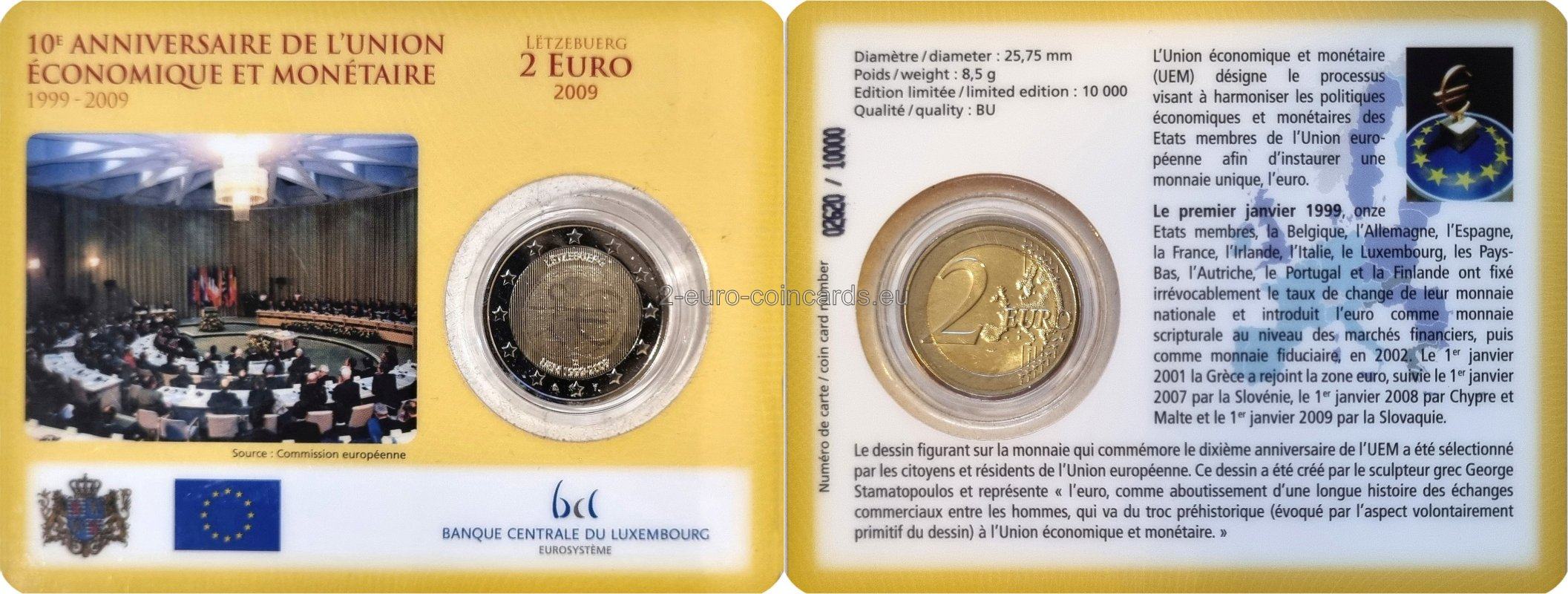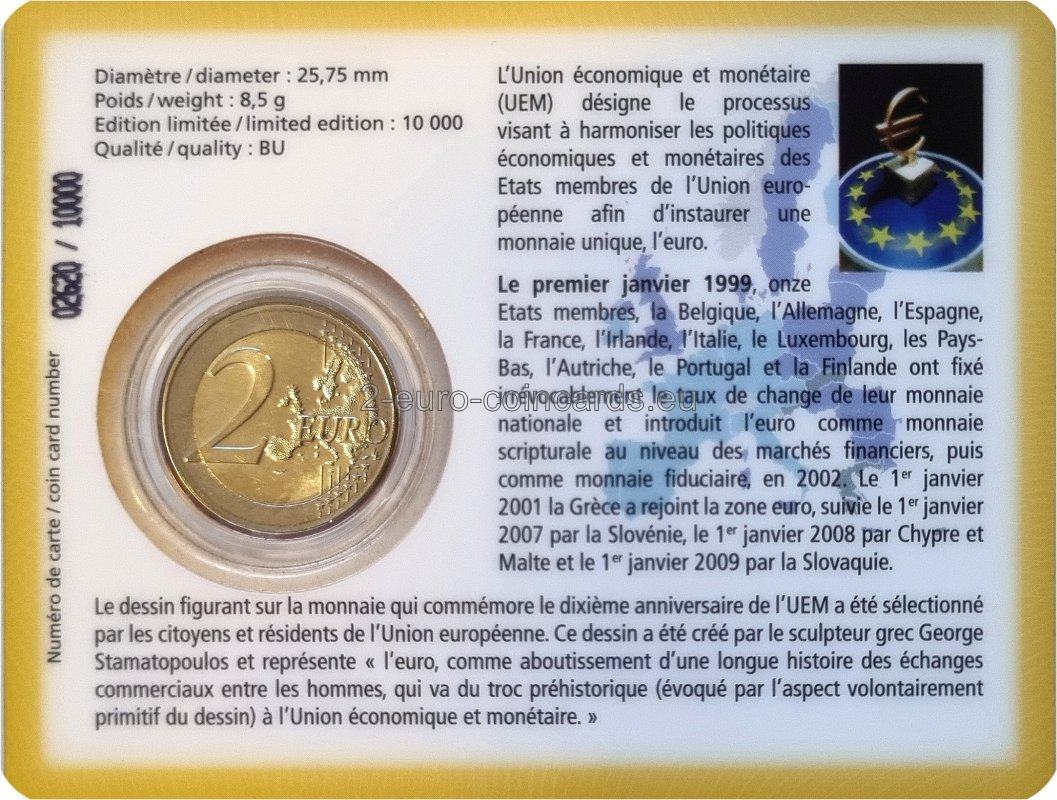 Hospodárska a menová únia (HMÚ) je proces harmonizácie hospodárskych a menových politík členských štátov Európskej únie s cieľom zaviesť jednotnú menu euro. Jedenásť členských štátov - Belgicko, Nemecko, Španielsko, Francúzsko, Írsko, Taliansko, Luxembursko, Holandsko, Rakúsko, Portugalsko a Fínsko - 1. januára 1999 neodvolateľne stanovilo výmenný kurz svojich národných mien a zaviedlo euro ako skriptúrnu menu na finančných trhoch, v roku 2002 potom ako fiduciárnu menu. Grécko vstúpilo do eurozóny 1. januára 2001, Slovinsko 1. januára 2007, Cyprus a Malta 1. januára 2008 a Slovensko 1. januára 2009. Návrh na menu pripomínajúci desiate výročie HMÚ vybrali občania a obyvatelia Európskej únie. Návrh vytvoril grécky sochár George Stamatopoulos a znázorňuje "euro ako vyvrcholenie dlhej histórie obchodu medzi ľuďmi, od prehistorickej výmeny (ktorú evokuje zámerne primitívny vzhľad návrhu) až po hospodársku a menovú úniu".