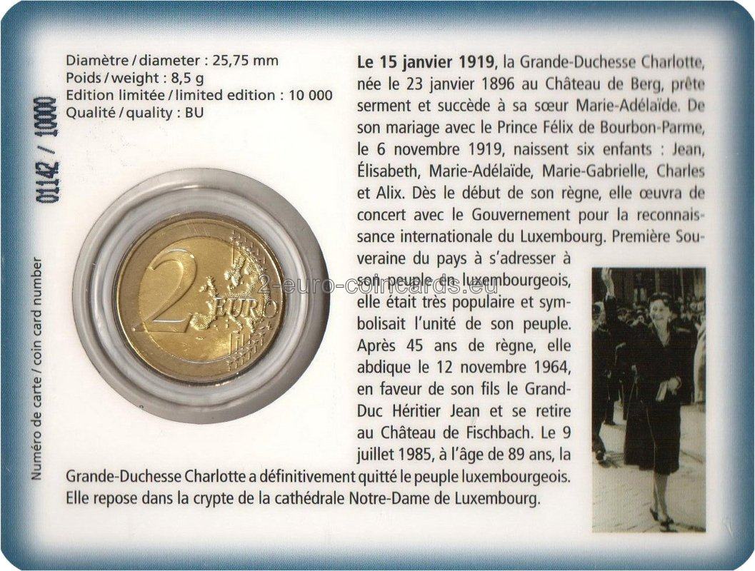 Dňa 15. januára 1919 veľkovojvodkyňa Šarlota, narodená 23. januára 1896 na zámku Berg, zložila prísahu a nastúpila po svojej sestre Márii-Adélaïde. Za princa Félixa Bourbonského Parmského sa vydala 6. novembra 1919 a mala šesť detí: Jean, Élisabeth, Marie-Adélaïde, Marie-Gabrielle, Charles a Alix. Od začiatku svojej vlády spolupracovala s vládou na získaní medzinárodného uznania pre Luxembursko. Ako prvá panovníčka krajiny, ktorá sa k svojmu ľudu prihovorila v luxemburčine, bola veľmi populárna a symbolizovala jednotu svojho národa. Dňa 12. novembra 1964 po 45 rokoch vlády abdikovala v prospech svojho syna, dedičného veľkovojvodu Jána, a odišla na odpočinok na zámok Fischbach. Dňa 9. júla 1985 vo veku 89 rokov veľkovojvodkyňa Šarlota navždy opustila luxemburský ľud. Jej ostatky boli uložené na večný odpočinok v krypte katedrály Notre-Dame v Luxemburgu.