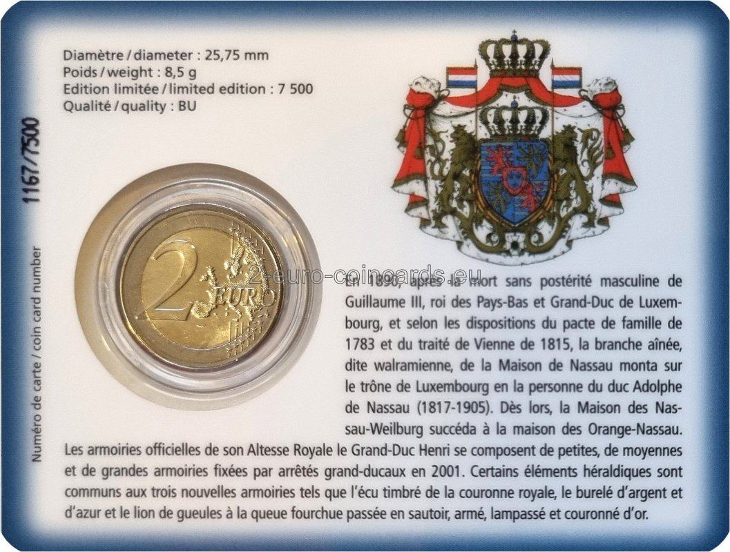 V roku 1890, po smrti holandského kráľa a luxemburského veľkovojvodu Viliama III. bez mužského potomstva a v súlade s ustanoveniami rodinnej zmluvy z roku 1783 a Viedenskej zmluvy z roku 1815, nastúpila na luxemburský trón najstaršia vetva rodu Nassau, známa ako Walramovská vetva, v osobe vojvodu Adolfa de Nassau (1817-1905). Odvtedy rod Nassau-Weilburg vystriedal rod Orange-Nassau. Oficiálny erb Jeho kráľovskej Výsosti veľkovojvodu Henricha pozostáva z malého, stredného a veľkého erbu stanoveného veľkovojvodským dekrétom v roku 2001. Určité heraldické prvky sú spoločné pre tri nové erby, ako je kráľovská koruna, štít so striebornými a azúrovými pruhmi, korunovaným zlatým levom s rozvetveným chvostom a vyplazeným jazykom.