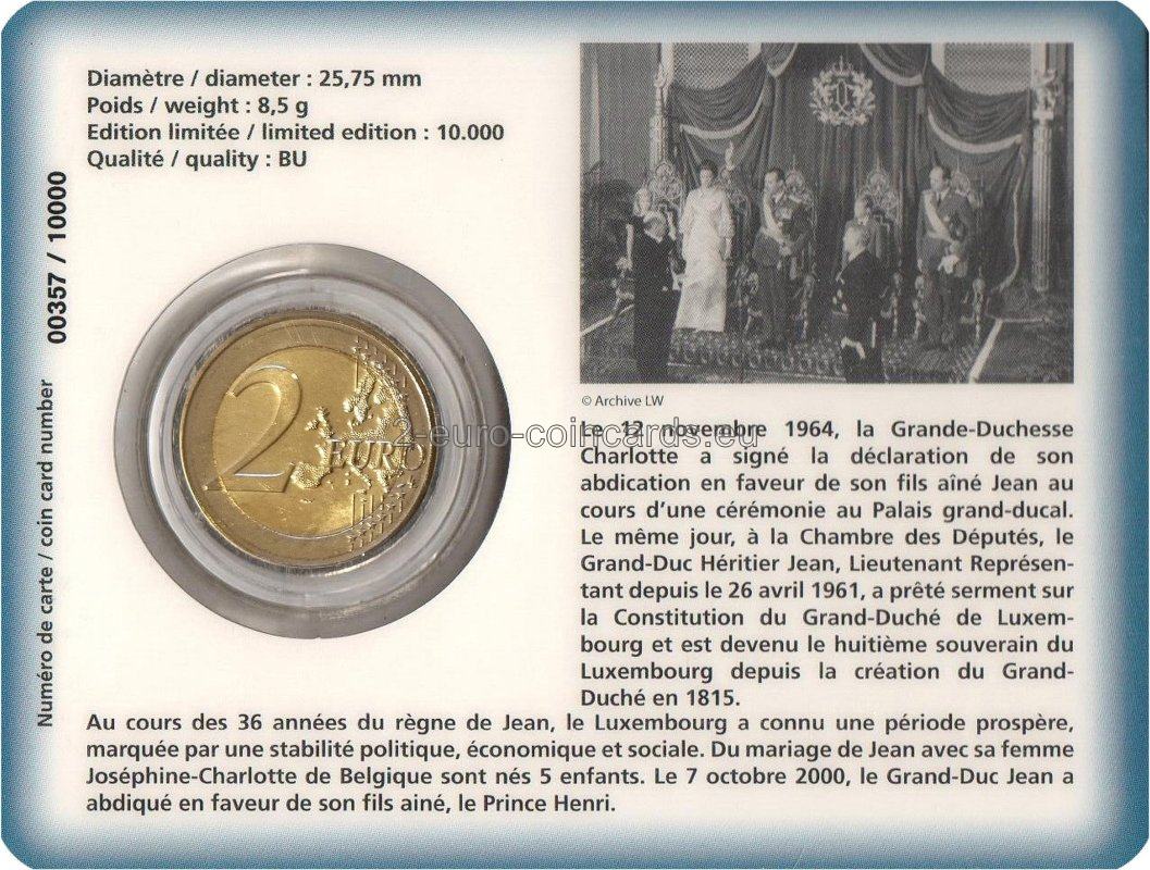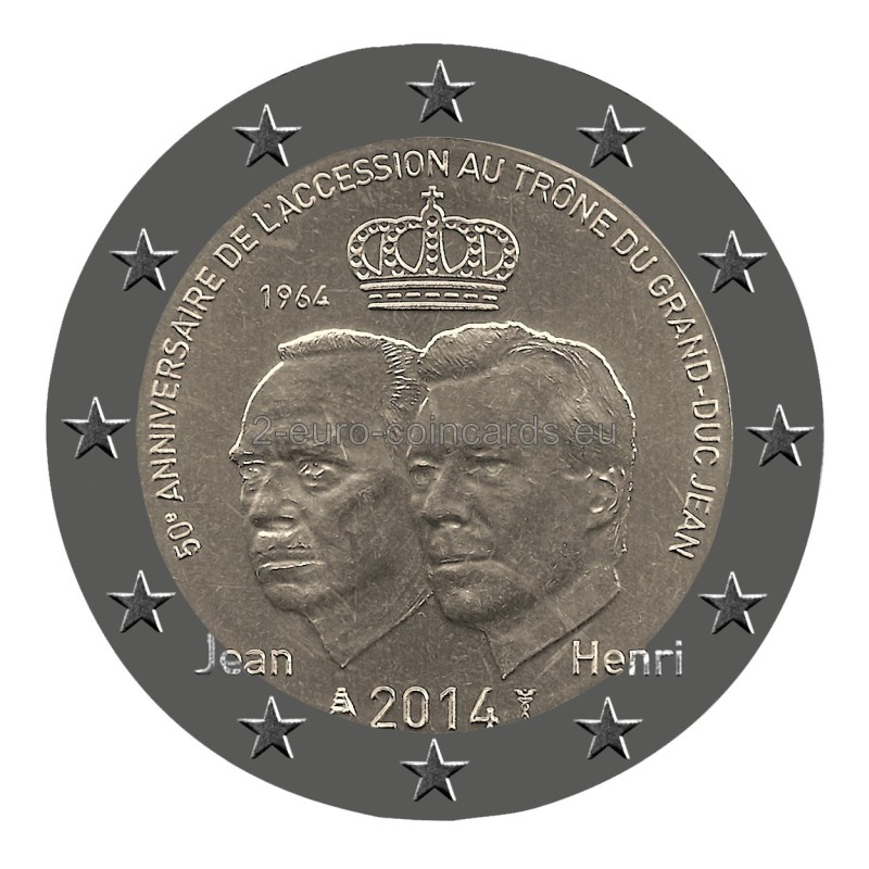 Na vnútornej časti mince sú vyobrazené podobizne ich kráľovskej výsosti, veľkovojvodu Henricha a veľkovojvodu Jána, obaja hľadia doľava. Nad podobizňou veľkovojvodu Jána je uvedený rok „1964“ a nad obidvoma je vyobrazená koruna. V spodnej časti sú uvedené mená „Jean“ a „Henri“ pod príslušnými podobizňami a rok „2014“ umiestnený medzi značkami Kráľovskej holandskej mincovne v Utrechte (Merkúrova palica) a značkou jej riaditeľa (Maarten Brouwer, plachetnica). Nápis „50e ANNIVERSAIRE DE L’ACCESSION AU TRÔNE DU GRAND-DUC JEAN“ (50. výročie nástupu veľkovojvodu Jeana na trón) obopína hornú vnútornú časť mince v kruhovom tvare.